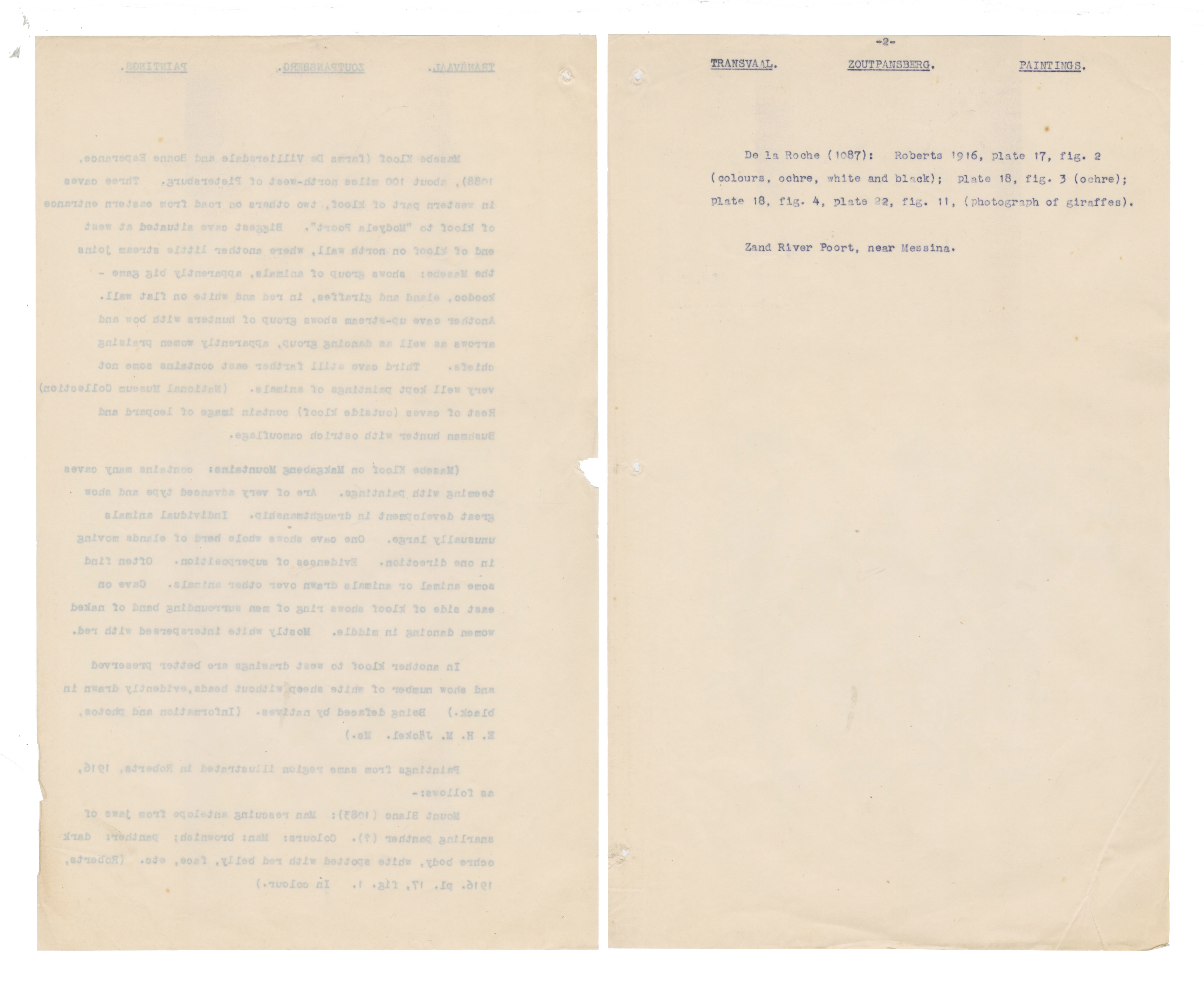 Typewritten notes (facsimiles?) on sheer paper about southern African rock engravings.