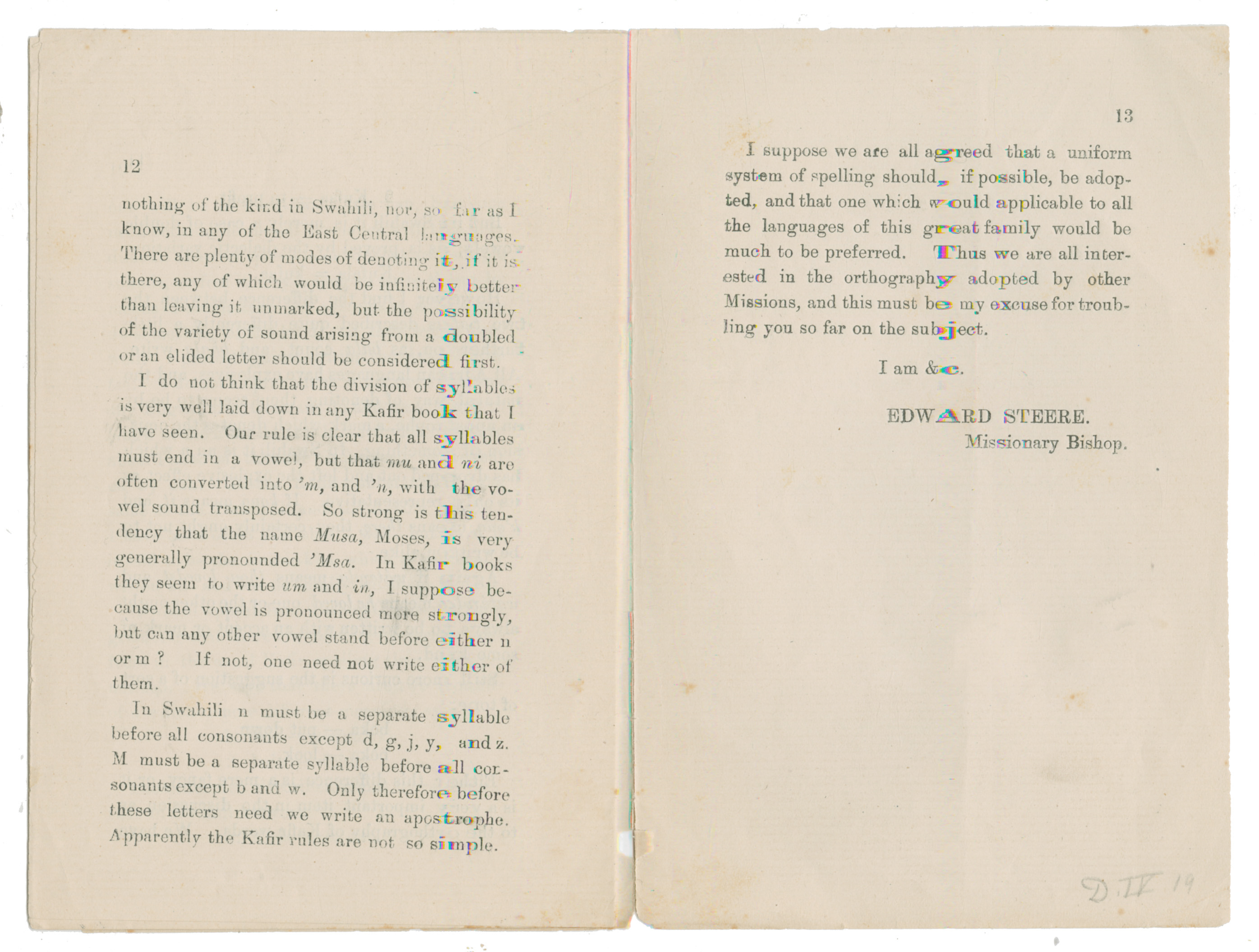 Edward Steere (b. 1828 - d. 1882) was an Anglican missionary and bishop in Africa, consecrated bishop of Central Africa in 1874 (succeeding William George Tozer [Bishop Charles Mackenzie's successor]).
