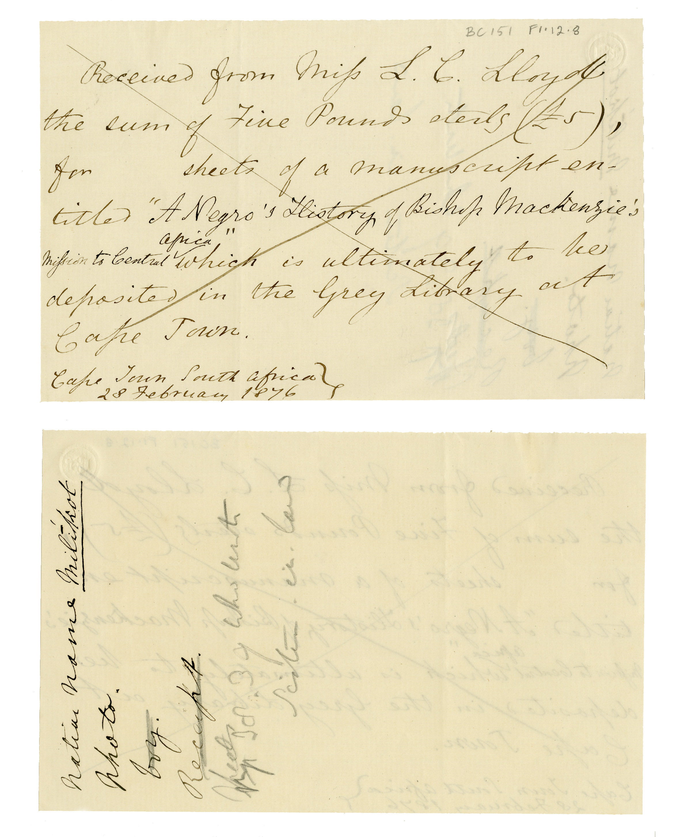 Receipt (obverse and reverse) written by Lucy Lloyd and signed by Charles Thomas.