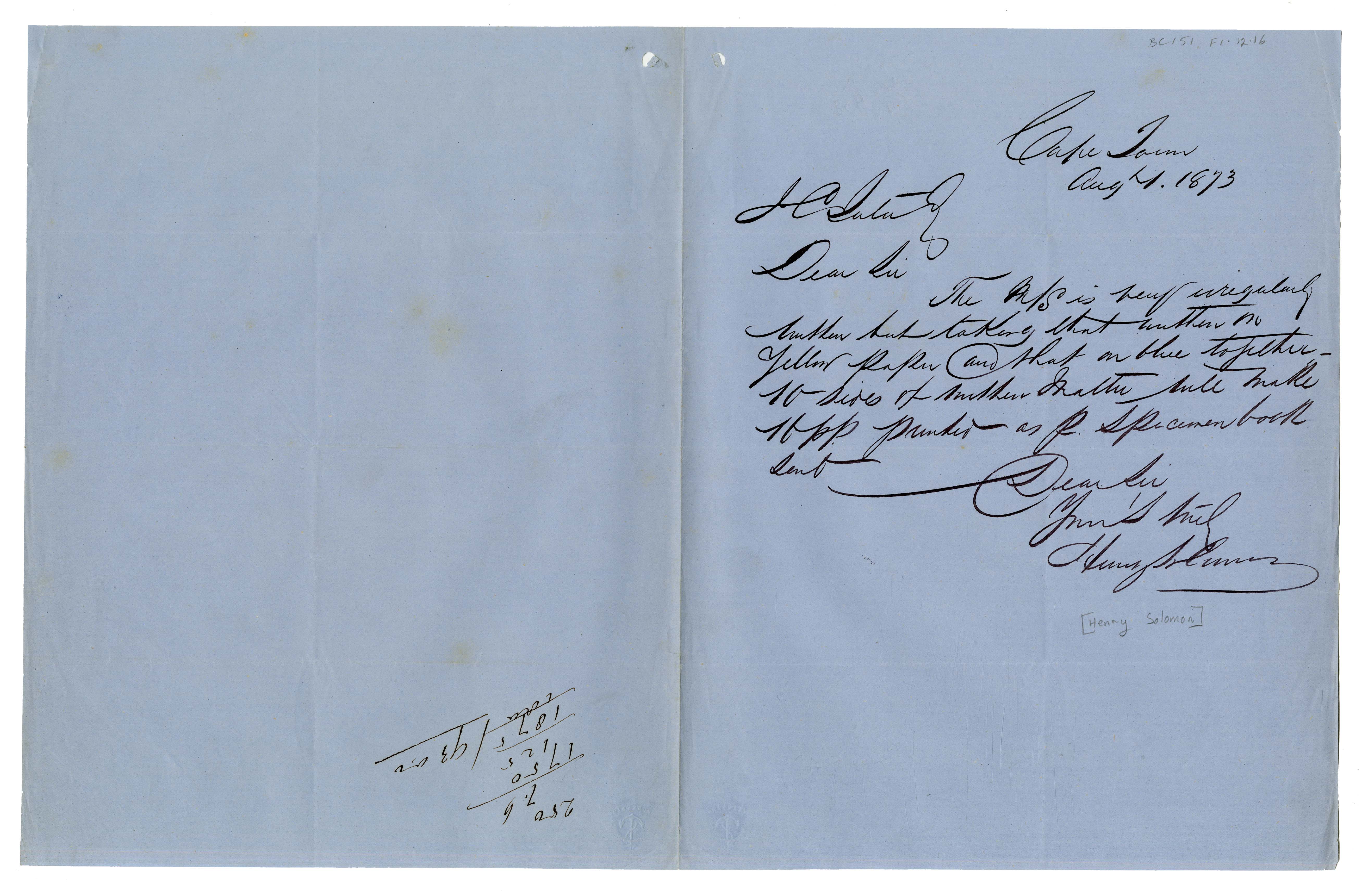 A letter from Henry Solomon to the publisher and bookseller, Jan Carel Juta (b. 1824 - d. 1886).