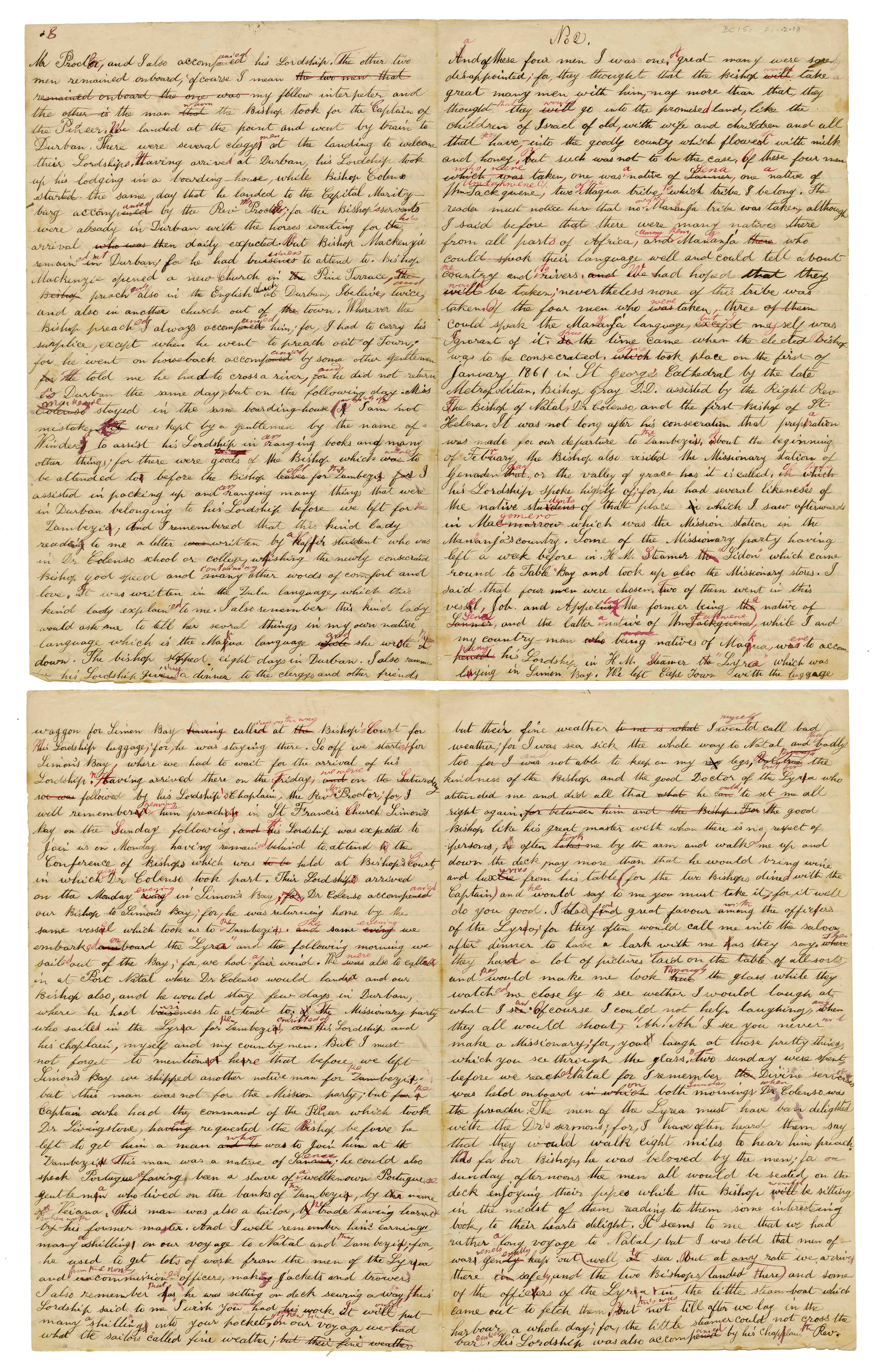 Sheet No. 2 of 'A Negro's History of Bishop Mackenzie's Mission to Central Africa' (MS), partly corrected by WHI Bleek. The Universities' Mission to Central Africa (UMCA), led by Bishop Charles Mackenzie, operated in a region that crossed what are now the borders of Mozambique and Malawi (formerly Nyasaland). After Mackenzie's death (in 1862) and the failure of the Magomero mission, the UMCA relocated to other areas, including Zanzibar, where it became very successful.