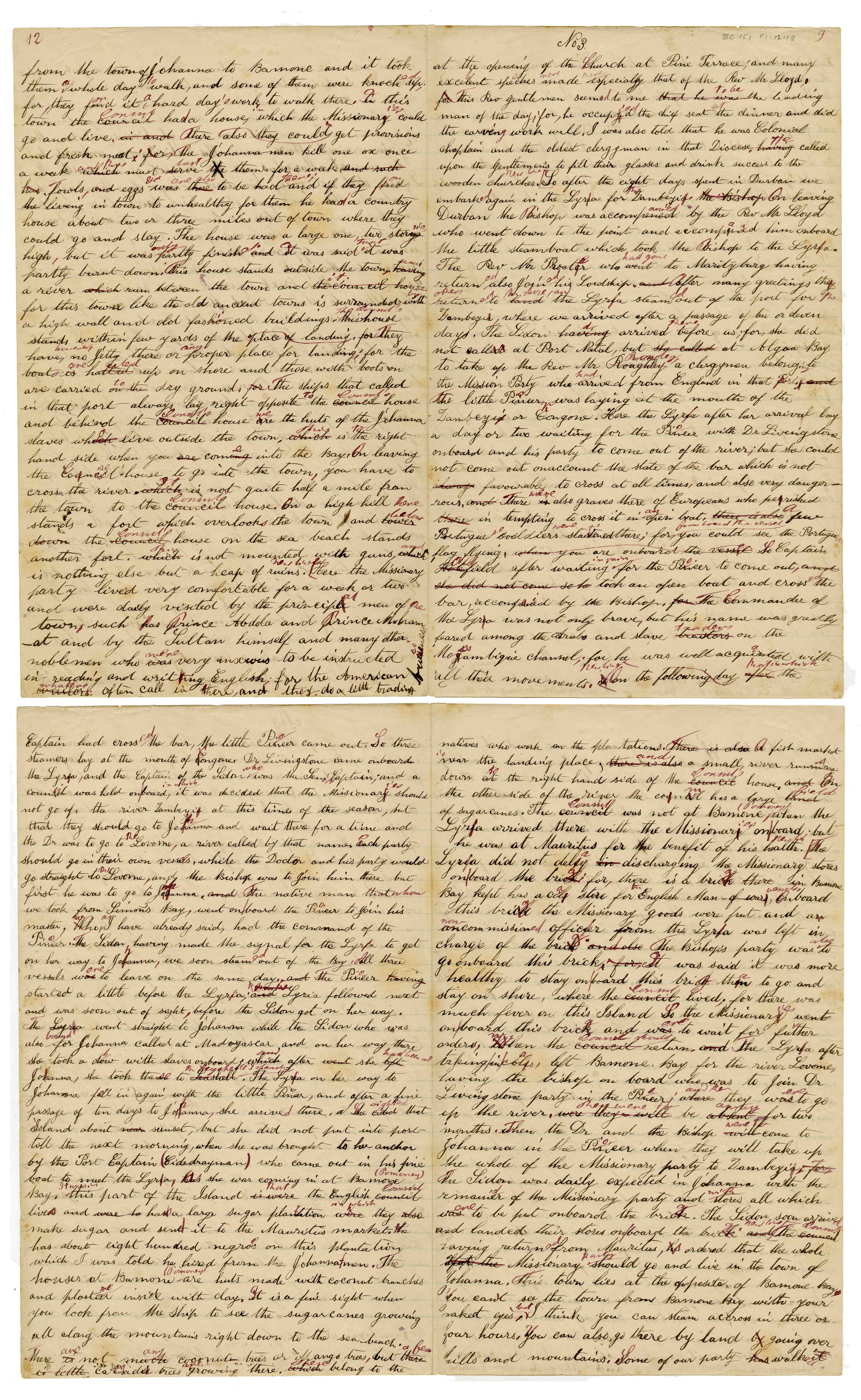 Sheet No. 3 of 'A Negro's History of Bishop Mackenzie's Mission to Central Africa' (MS), partly corrected by WHI Bleek. The Universities' Mission to Central Africa (UMCA), led by Bishop Charles Mackenzie, operated in a region that crossed what are now the borders of Mozambique and Malawi (formerly Nyasaland). After Mackenzie's death (in 1862) and the failure of the Magomero mission, the UMCA relocated to other areas, including Zanzibar, where it became very successful.