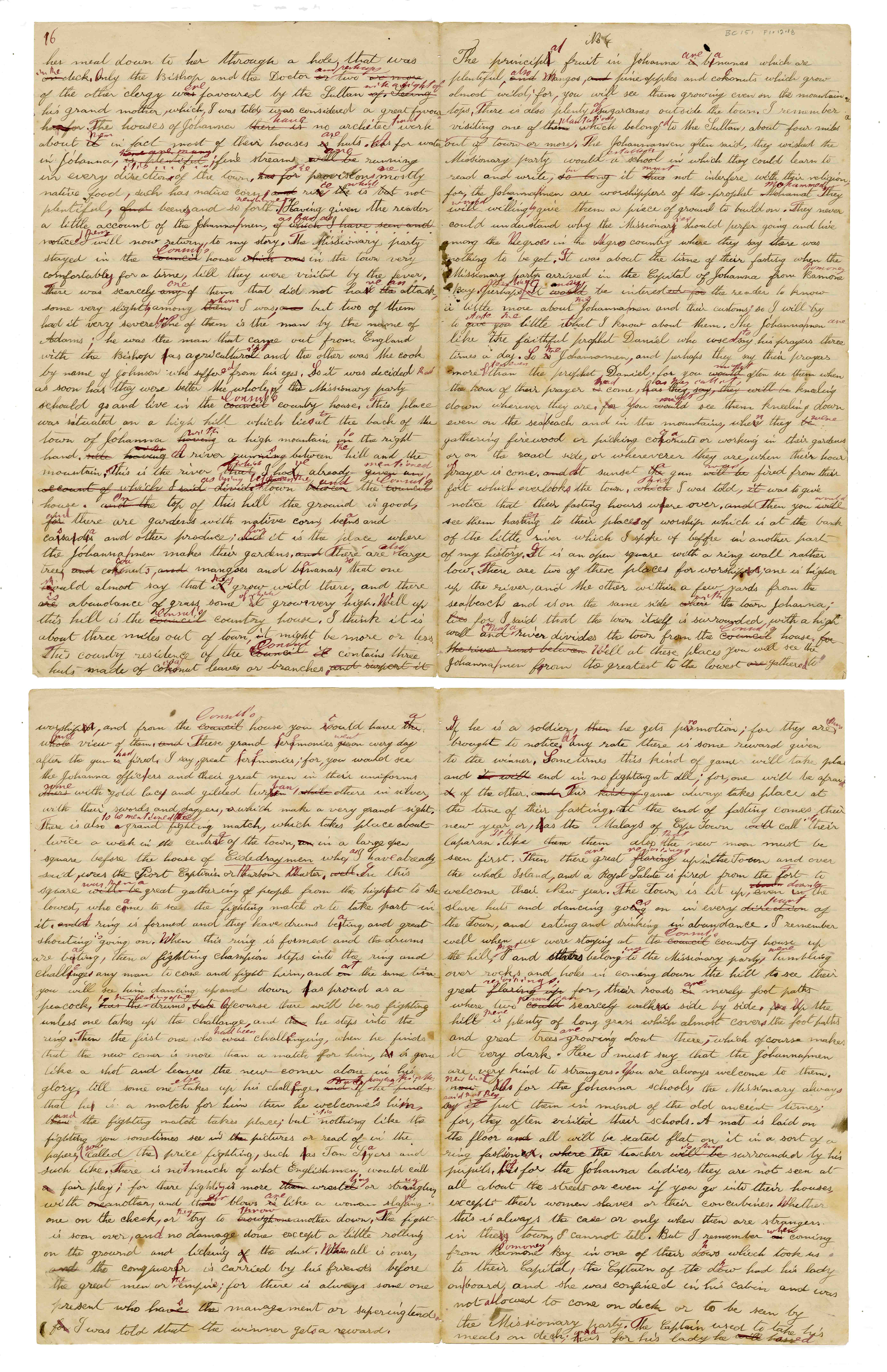 Sheet No. 4 of 'A Negro's History of Bishop Mackenzie's Mission to Central Africa' (MS), partly corrected by WHI Bleek. The Universities' Mission to Central Africa (UMCA), led by Bishop Charles Mackenzie, operated in a region that crossed what are now the borders of Mozambique and Malawi (formerly Nyasaland). After Mackenzie's death (in 1862) and the failure of the Magomero mission, the UMCA relocated to other areas, including Zanzibar, where it became very successful.