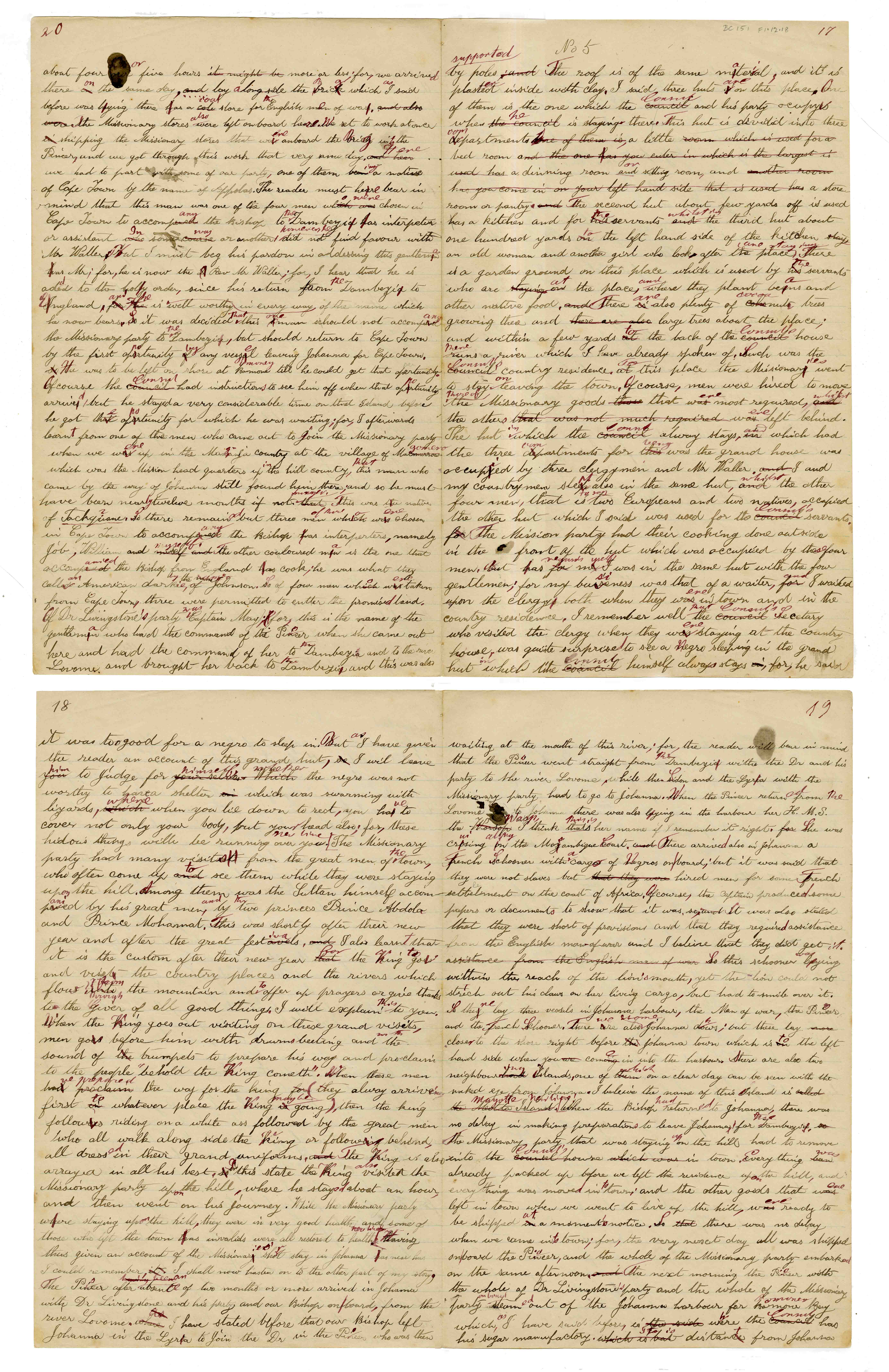 Sheet No. 5 of 'A Negro's History of Bishop Mackenzie's Mission to Central Africa' (MS), partly corrected by WHI Bleek. The Universities' Mission to Central Africa (UMCA), led by Bishop Charles Mackenzie, operated in a region that crossed what are now the borders of Mozambique and Malawi (formerly Nyasaland). After Mackenzie's death (in 1862) and the failure of the Magomero mission, the UMCA relocated to other areas, including Zanzibar, where it became very successful.