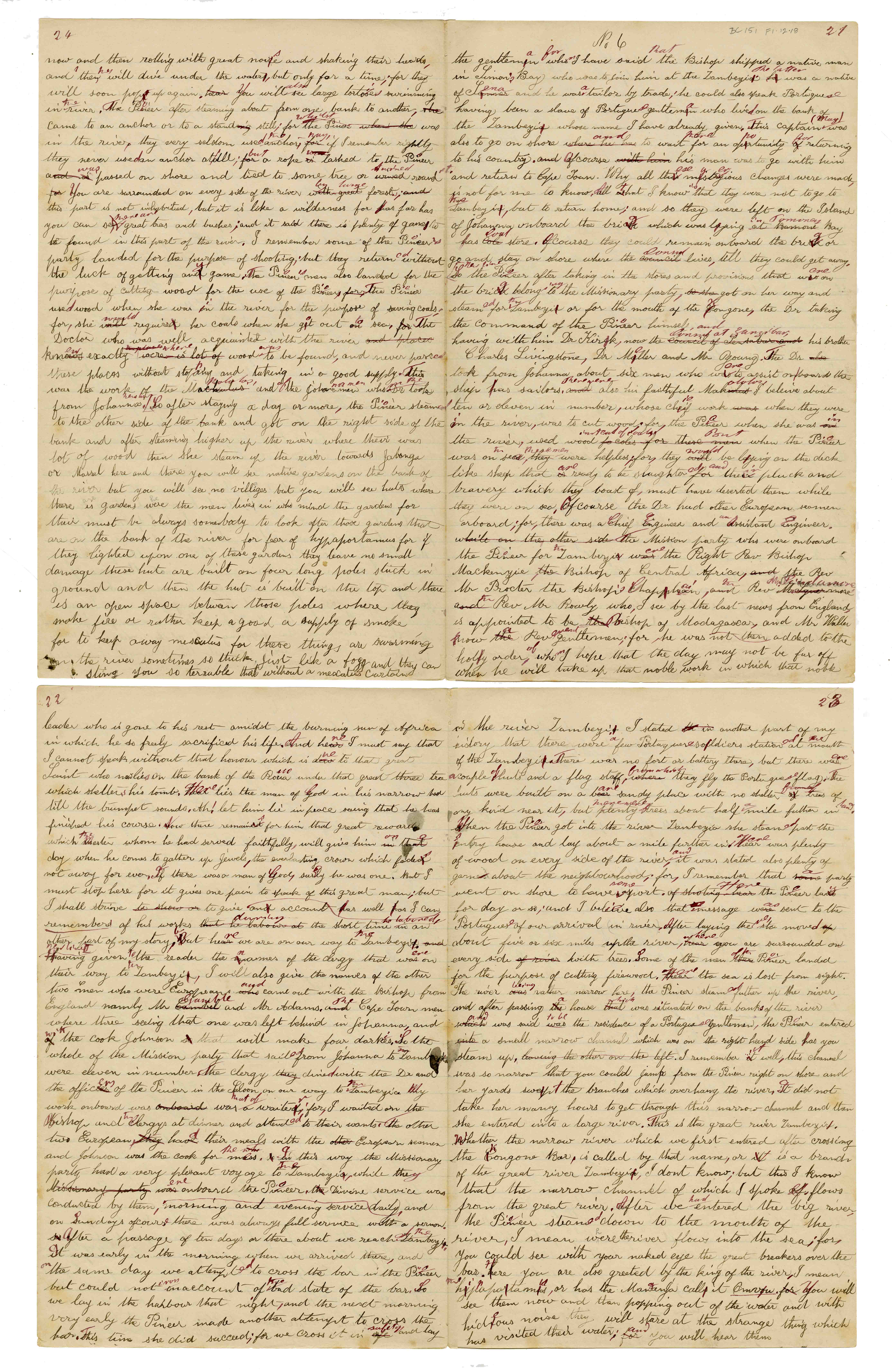 Sheet No. 6 of 'A Negro's History of Bishop Mackenzie's Mission to Central Africa' (MS), partly corrected by WHI Bleek. The Universities' Mission to Central Africa (UMCA), led by Bishop Charles Mackenzie, operated in a region that crossed what are now the borders of Mozambique and Malawi (formerly Nyasaland). After Mackenzie's death (in 1862) and the failure of the Magomero mission, the UMCA relocated to other areas, including Zanzibar, where it became very successful.