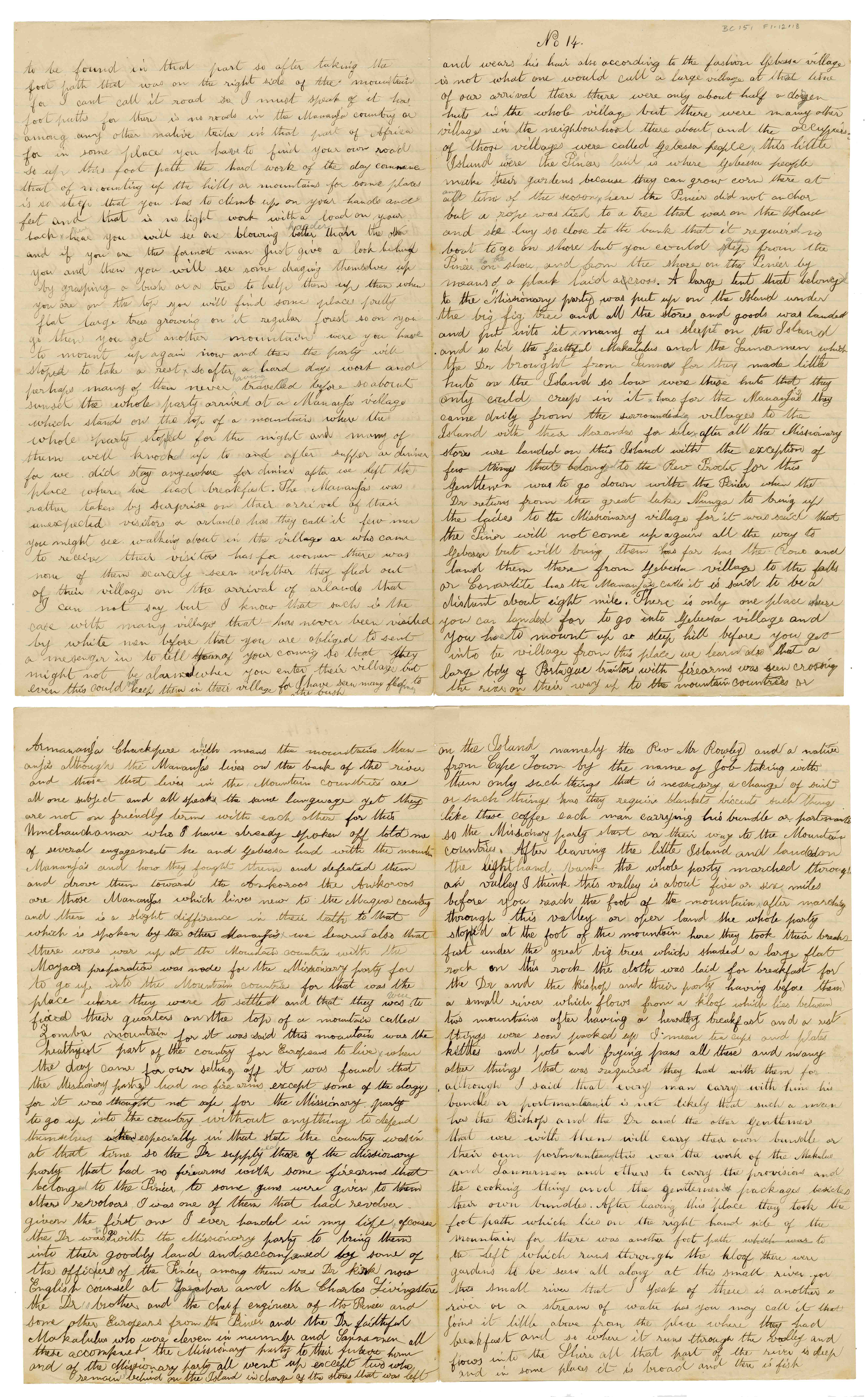 Sheet No. 14 of 'A Negro's History of Bishop Mackenzie's Mission to Central Africa' (MS), partly corrected by WHI Bleek. The Universities' Mission to Central Africa (UMCA), led by Bishop Charles Mackenzie, operated in a region that crossed what are now the borders of Mozambique and Malawi (formerly Nyasaland). After Mackenzie's death (in 1862) and the failure of the Magomero mission, the UMCA relocated to other areas, including Zanzibar, where it became very successful.