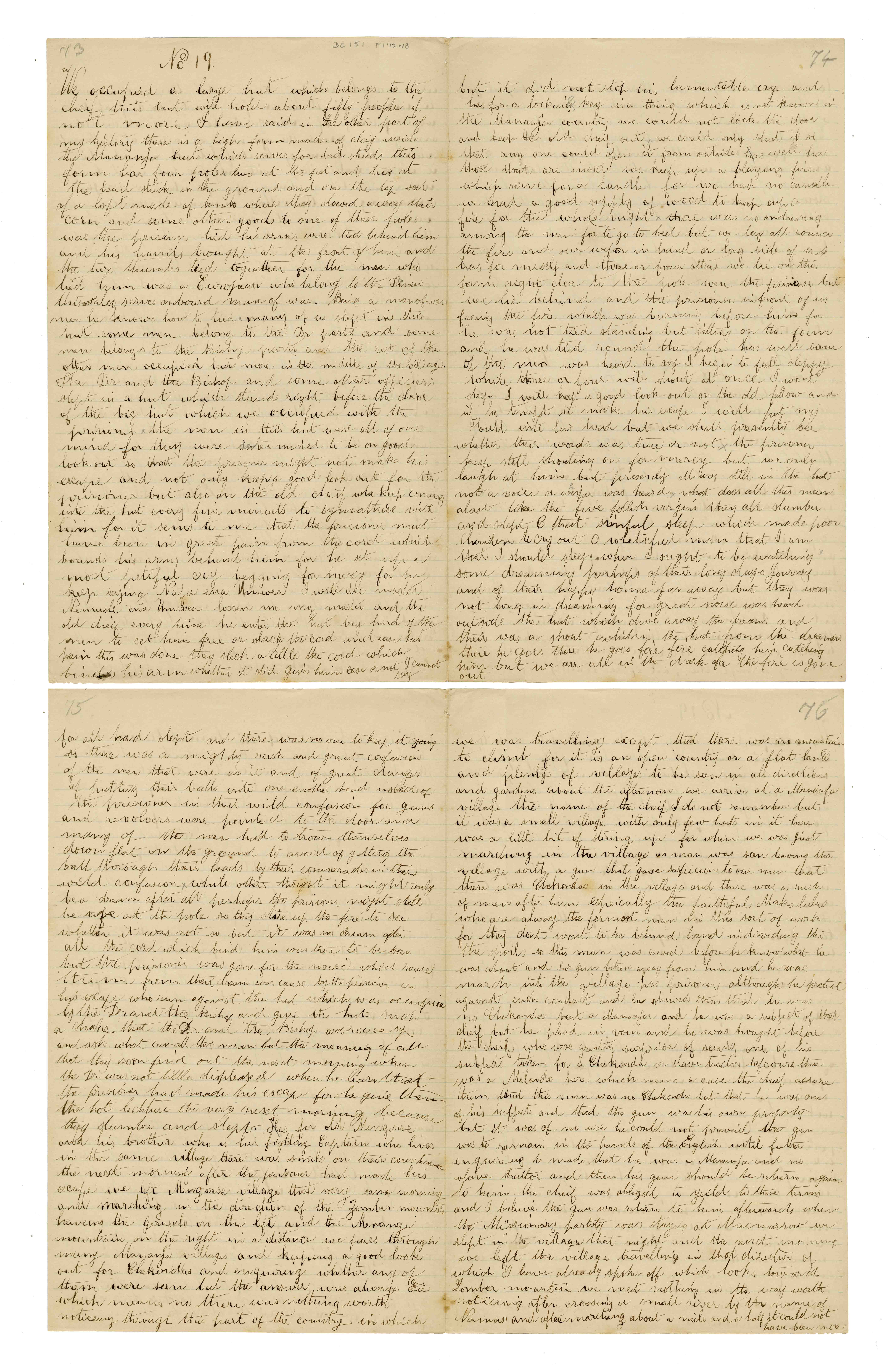 Sheet No. 19 of 'A Negro's History of Bishop Mackenzie's Mission to Central Africa' (MS), partly corrected by WHI Bleek. The Universities' Mission to Central Africa (UMCA), led by Bishop Charles Mackenzie, operated in a region that crossed what are now the borders of Mozambique and Malawi (formerly Nyasaland). After Mackenzie's death (in 1862) and the failure of the Magomero mission, the UMCA relocated to other areas, including Zanzibar, where it became very successful.