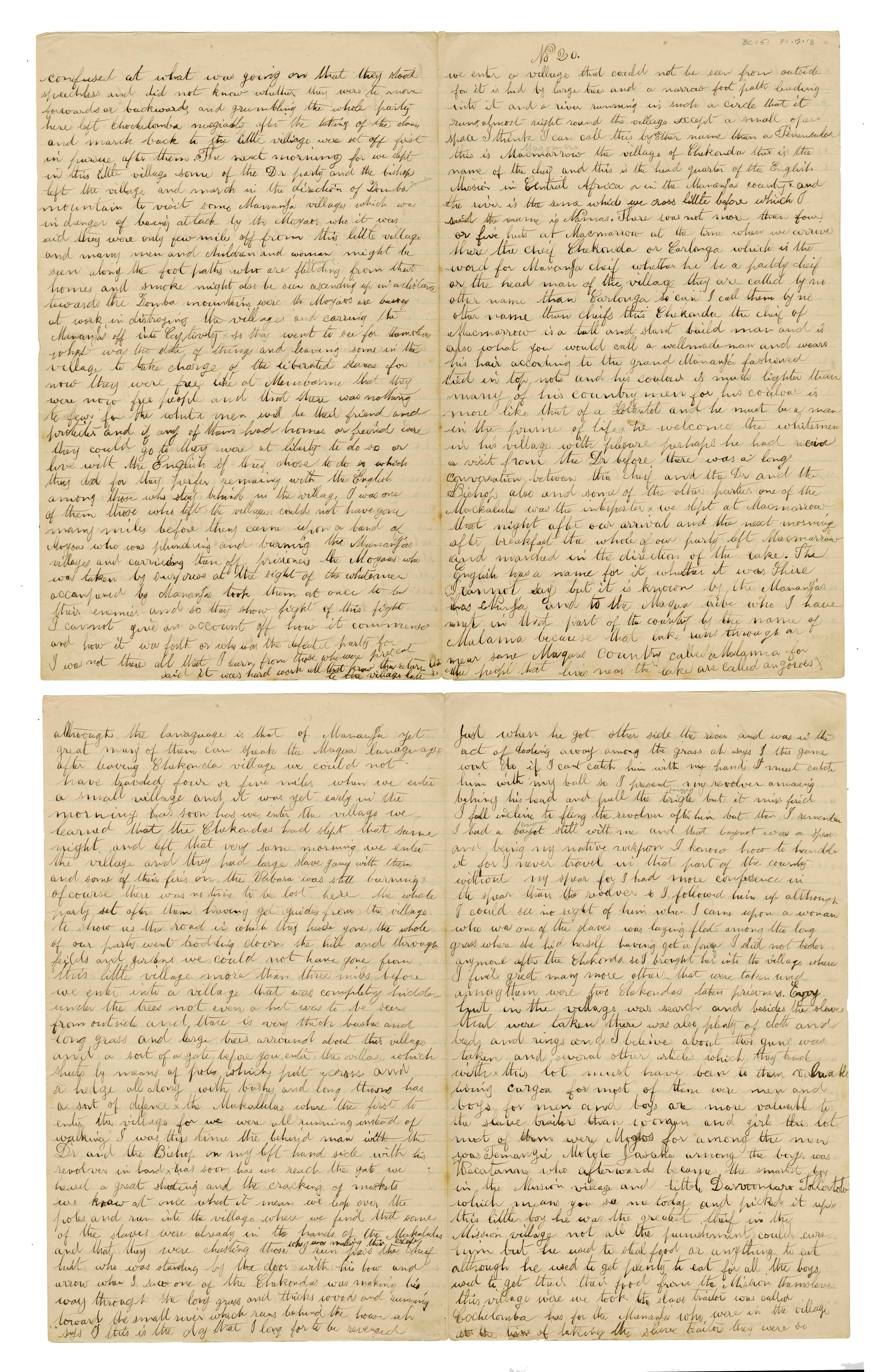 Sheet No. 20 of 'A Negro's History of Bishop Mackenzie's Mission to Central Africa' (MS), partly corrected by WHI Bleek. The Universities' Mission to Central Africa (UMCA), led by Bishop Charles Mackenzie, operated in a region that crossed what are now the borders of Mozambique and Malawi (formerly Nyasaland). After Mackenzie's death (in 1862) and the failure of the Magomero mission, the UMCA relocated to other areas, including Zanzibar, where it became very successful.