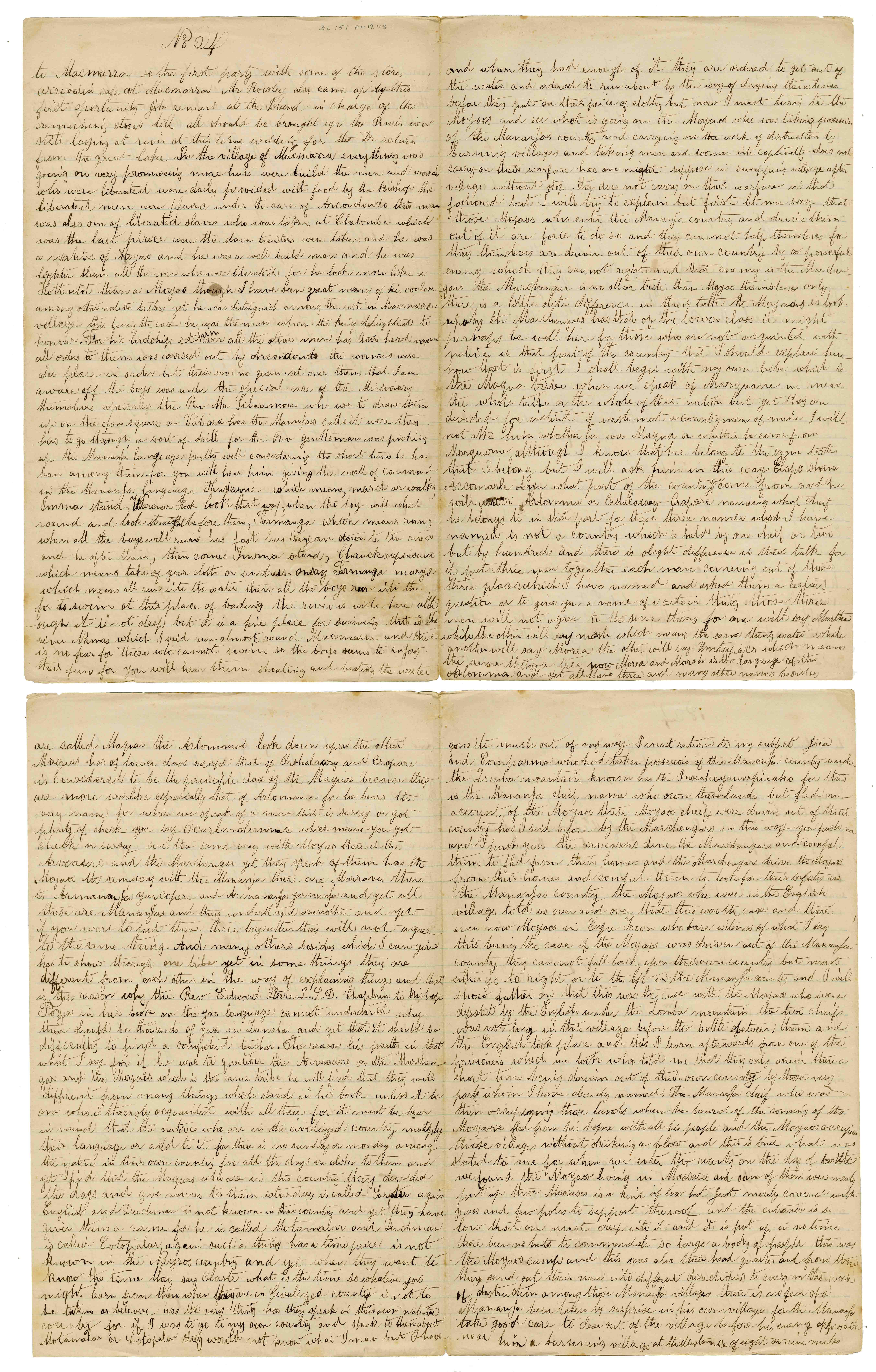 Sheet No. 24 of 'A Negro's History of Bishop Mackenzie's Mission to Central Africa' (MS), partly corrected by WHI Bleek. The Universities' Mission to Central Africa (UMCA), led by Bishop Charles Mackenzie, operated in a region that crossed what are now the borders of Mozambique and Malawi (formerly Nyasaland). After Mackenzie's death (in 1862) and the failure of the Magomero mission, the UMCA relocated to other areas, including Zanzibar, where it became very successful.