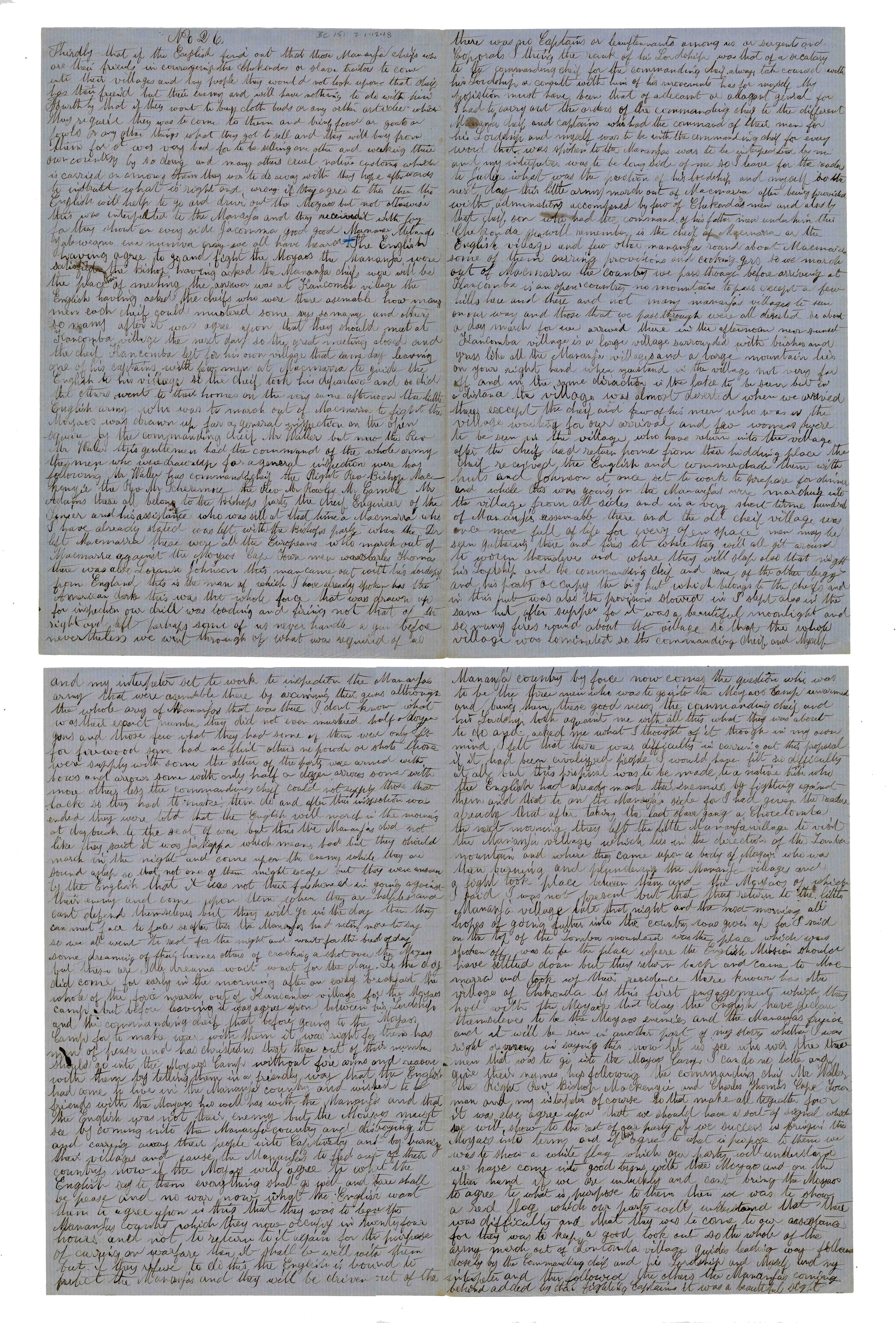 Sheet No. 26 of 'A Negro's History of Bishop Mackenzie's Mission to Central Africa' (MS), partly corrected by WHI Bleek. The Universities' Mission to Central Africa (UMCA), led by Bishop Charles Mackenzie, operated in a region that crossed what are now the borders of Mozambique and Malawi (formerly Nyasaland). After Mackenzie's death (in 1862) and the failure of the Magomero mission, the UMCA relocated to other areas, including Zanzibar, where it became very successful.