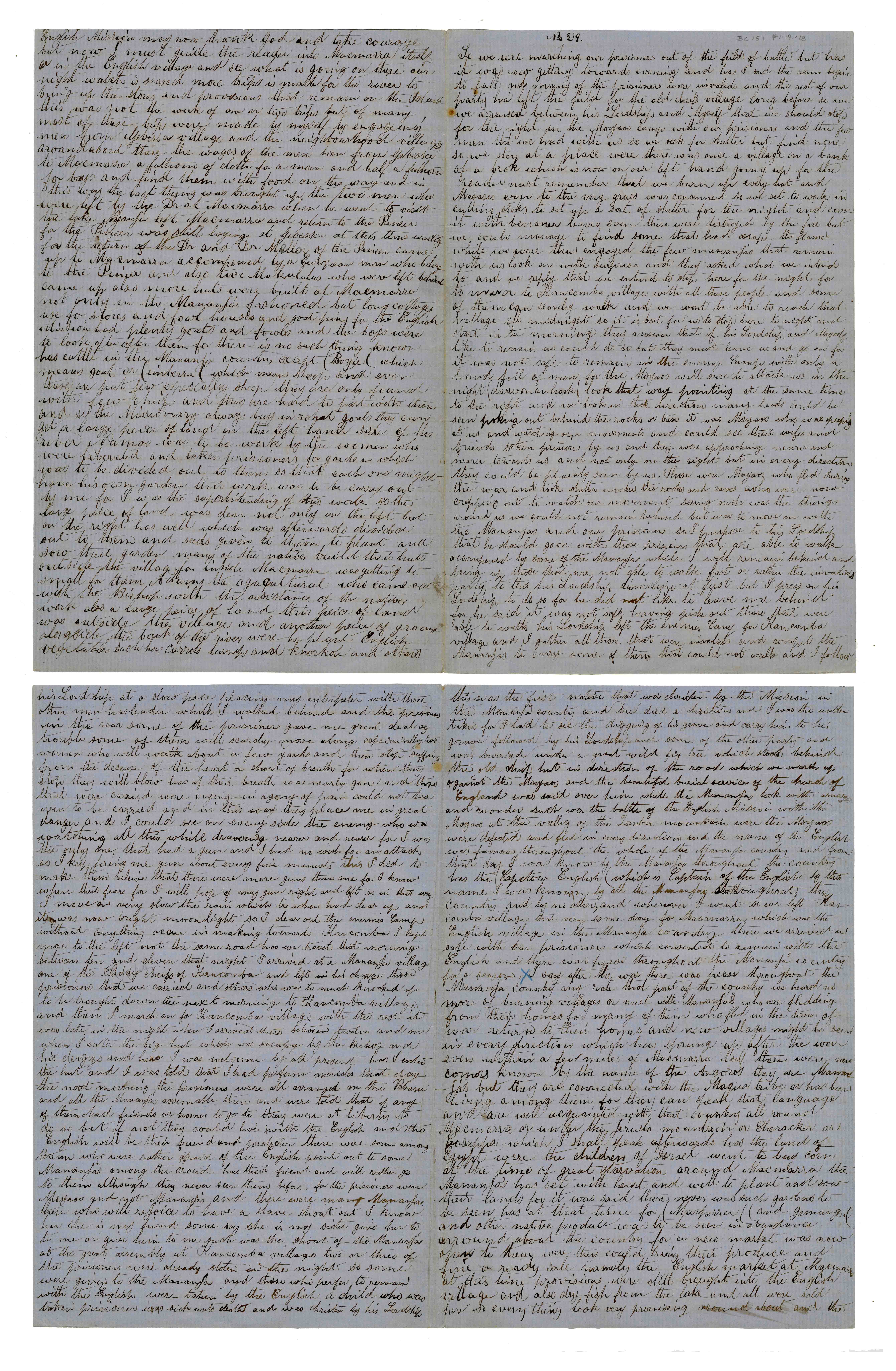 Sheet No. 29 of 'A Negro's History of Bishop Mackenzie's Mission to Central Africa' (MS), partly corrected by WHI Bleek. The Universities' Mission to Central Africa (UMCA), led by Bishop Charles Mackenzie, operated in a region that crossed what are now the borders of Mozambique and Malawi (formerly Nyasaland). After Mackenzie's death (in 1862) and the failure of the Magomero mission, the UMCA relocated to other areas, including Zanzibar, where it became very successful.