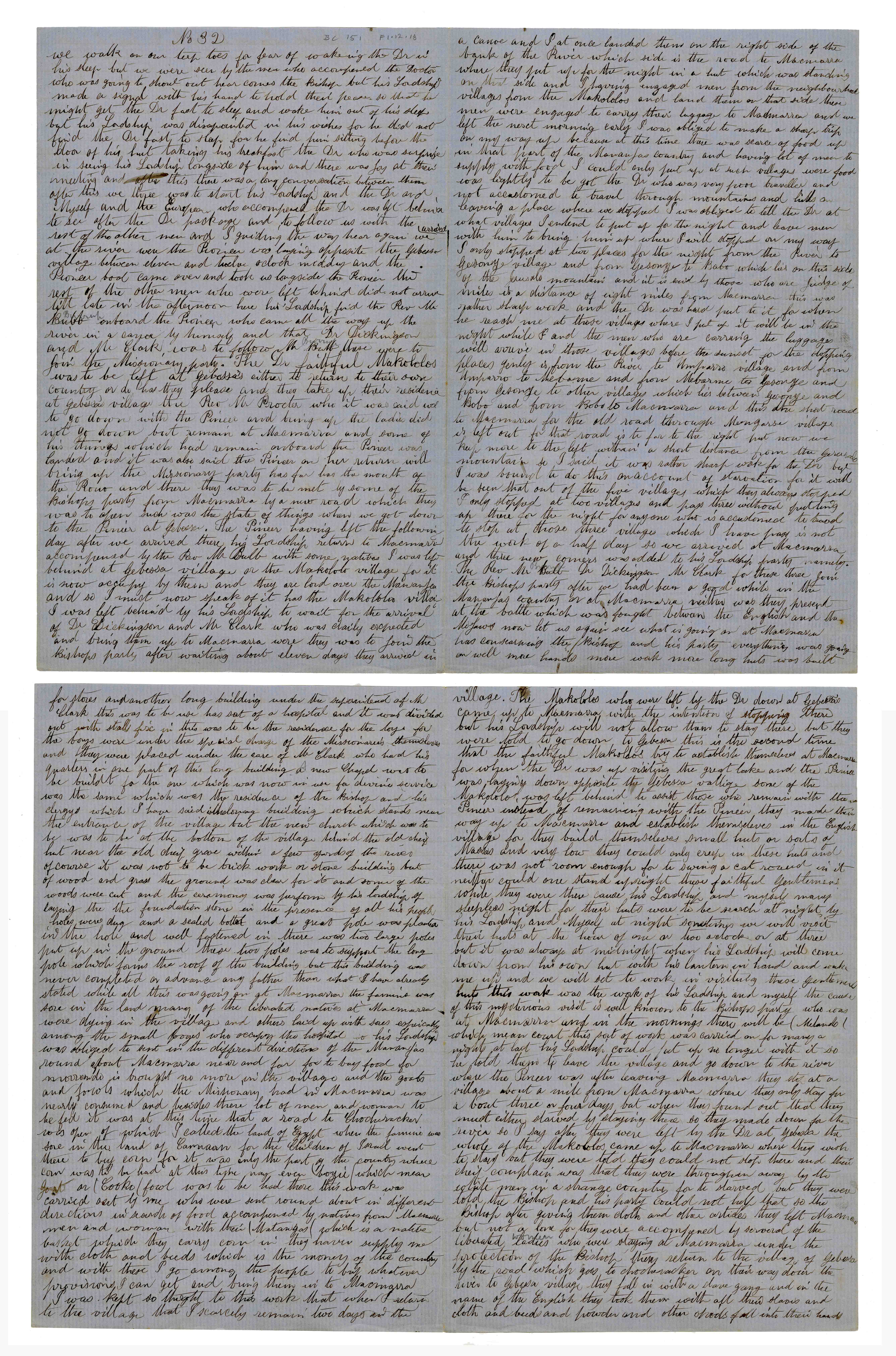 Sheet No. 32 of 'A Negro's History of Bishop Mackenzie's Mission to Central Africa' (MS), partly corrected by WHI Bleek. The Universities' Mission to Central Africa (UMCA), led by Bishop Charles Mackenzie, operated in a region that crossed what are now the borders of Mozambique and Malawi (formerly Nyasaland). After Mackenzie's death (in 1862) and the failure of the Magomero mission, the UMCA relocated to other areas, including Zanzibar, where it became very successful.