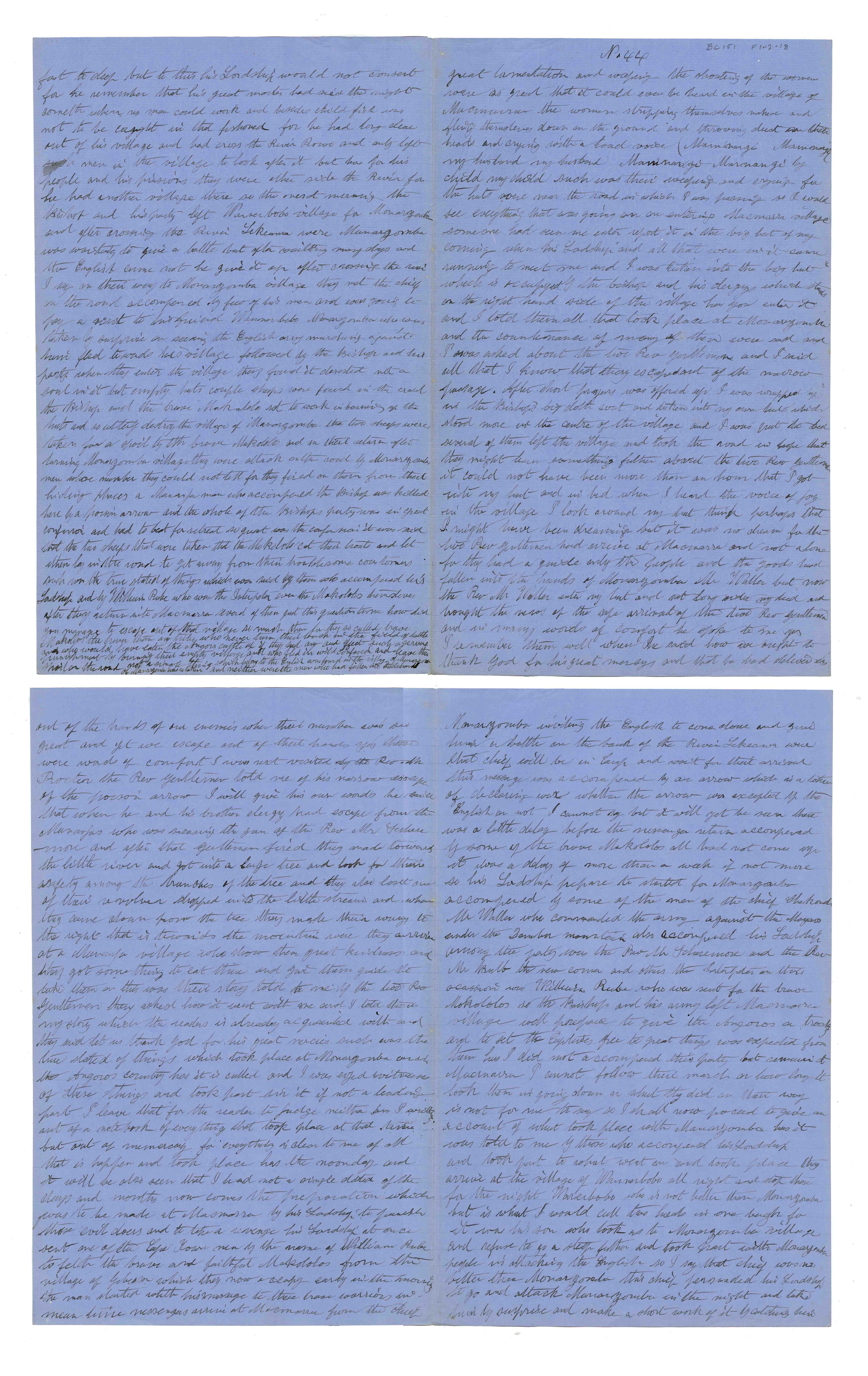 Sheet No. 44 of 'A Negro's History of Bishop Mackenzie's Mission to Central Africa' (MS), partly corrected by WHI Bleek. The Universities' Mission to Central Africa (UMCA), led by Bishop Charles Mackenzie, operated in a region that crossed what are now the borders of Mozambique and Malawi (formerly Nyasaland). After Mackenzie's death (in 1862) and the failure of the Magomero mission, the UMCA relocated to other areas, including Zanzibar, where it became very successful.