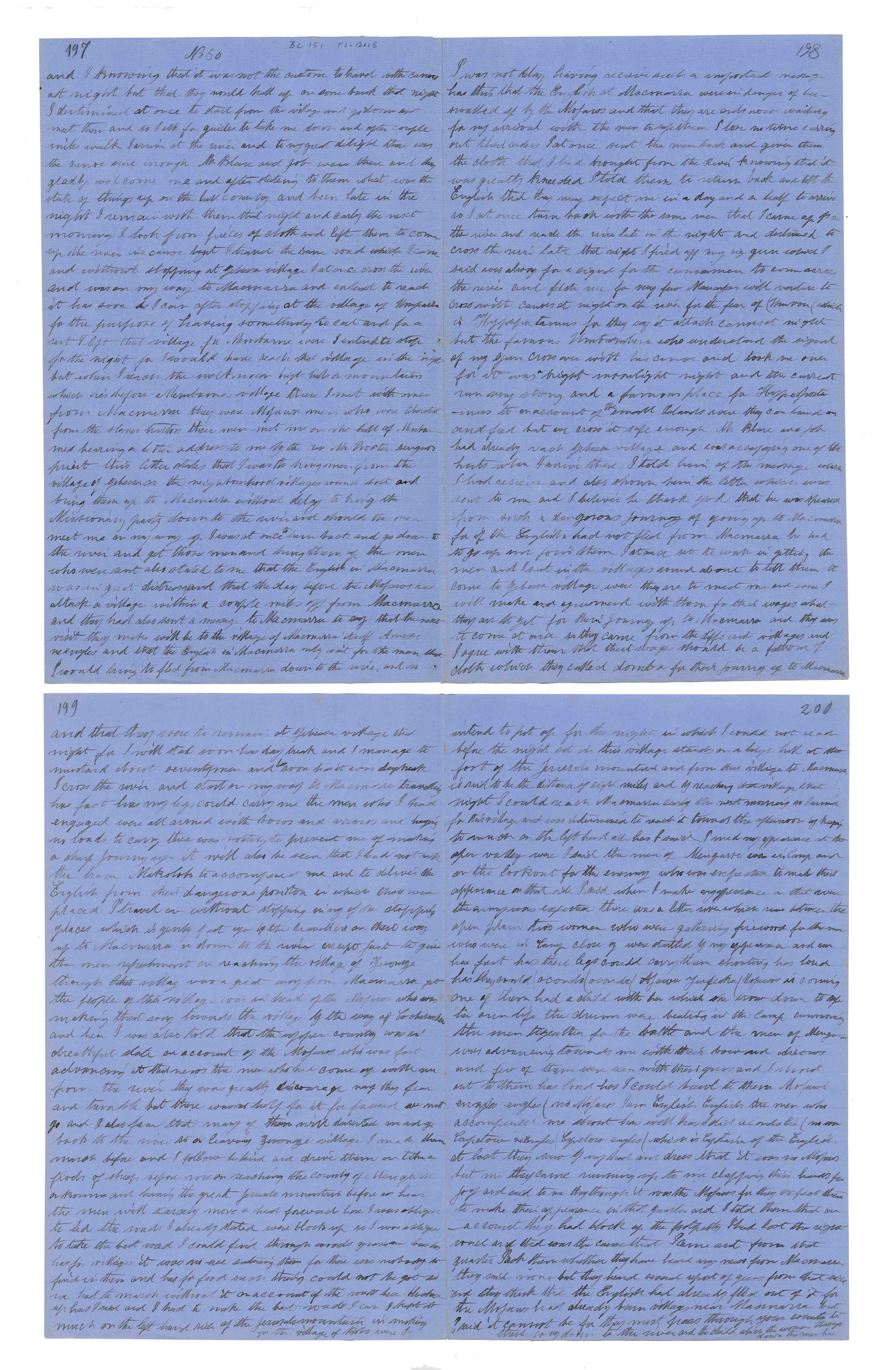 Sheet No. 50 of 'A Negro's History of Bishop Mackenzie's Mission to Central Africa' (MS), partly corrected by WHI Bleek. The Universities' Mission to Central Africa (UMCA), led by Bishop Charles Mackenzie, operated in a region that crossed what are now the borders of Mozambique and Malawi (formerly Nyasaland). After Mackenzie's death (in 1862) and the failure of the Magomero mission, the UMCA relocated to other areas, including Zanzibar, where it became very successful.