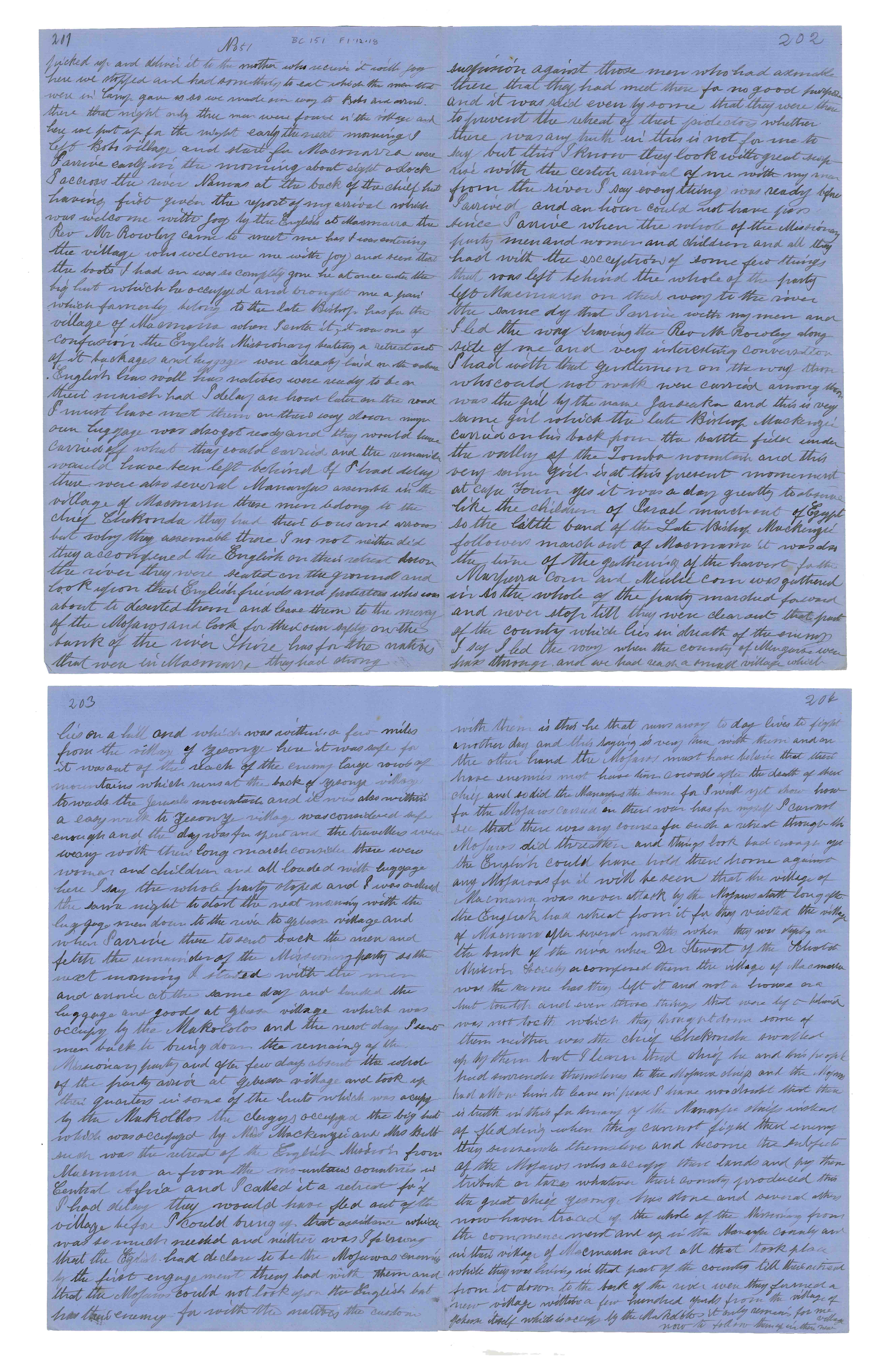 Sheet No. 51 of 'A Negro's History of Bishop Mackenzie's Mission to Central Africa' (MS), partly corrected by WHI Bleek. The Universities' Mission to Central Africa (UMCA), led by Bishop Charles Mackenzie, operated in a region that crossed what are now the borders of Mozambique and Malawi (formerly Nyasaland). After Mackenzie's death (in 1862) and the failure of the Magomero mission, the UMCA relocated to other areas, including Zanzibar, where it became very successful.
