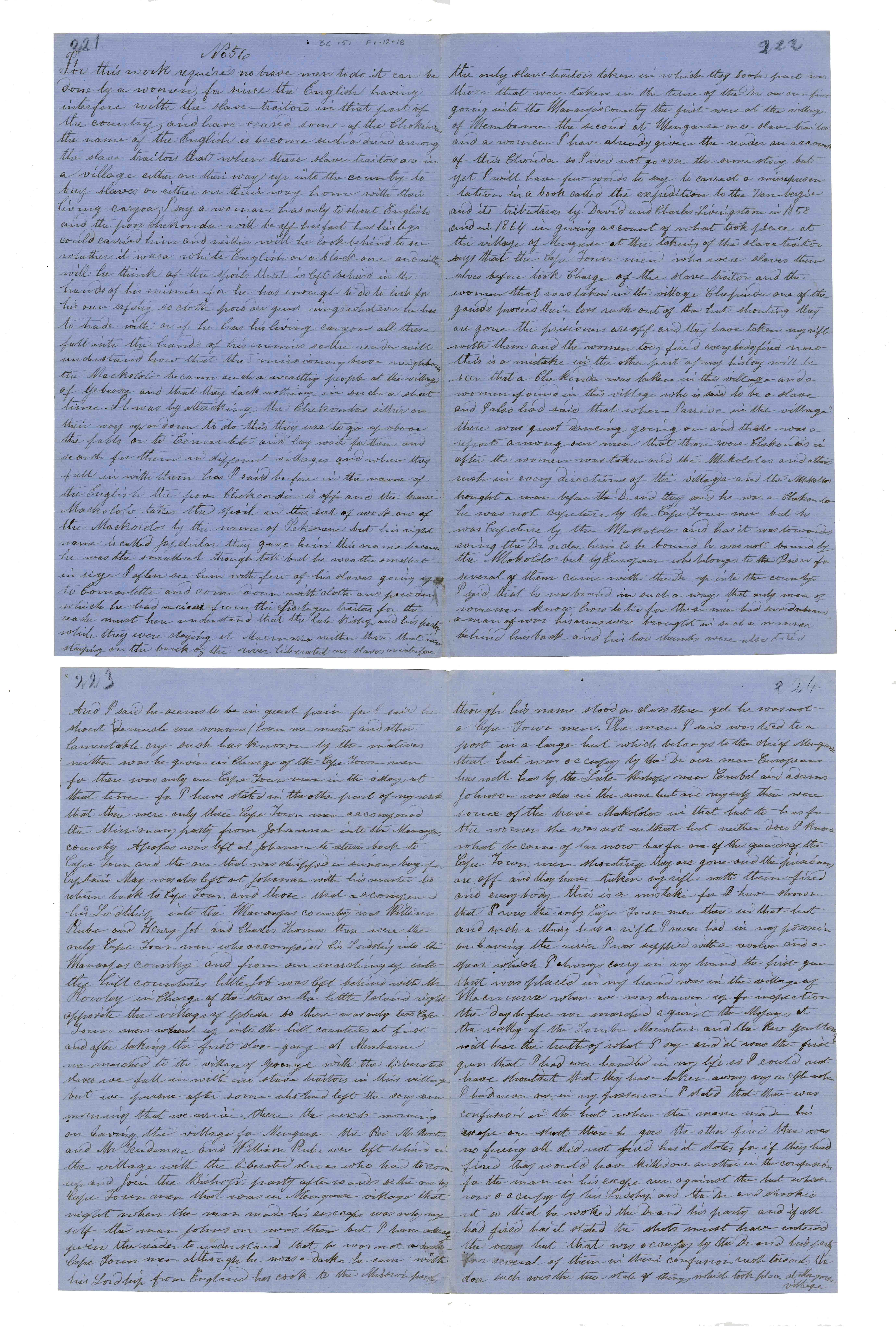 Sheet No. 56 of 'A Negro's History of Bishop Mackenzie's Mission to Central Africa' (MS), partly corrected by WHI Bleek. The Universities' Mission to Central Africa (UMCA), led by Bishop Charles Mackenzie, operated in a region that crossed what are now the borders of Mozambique and Malawi (formerly Nyasaland). After Mackenzie's death (in 1862) and the failure of the Magomero mission, the UMCA relocated to other areas, including Zanzibar, where it became very successful.