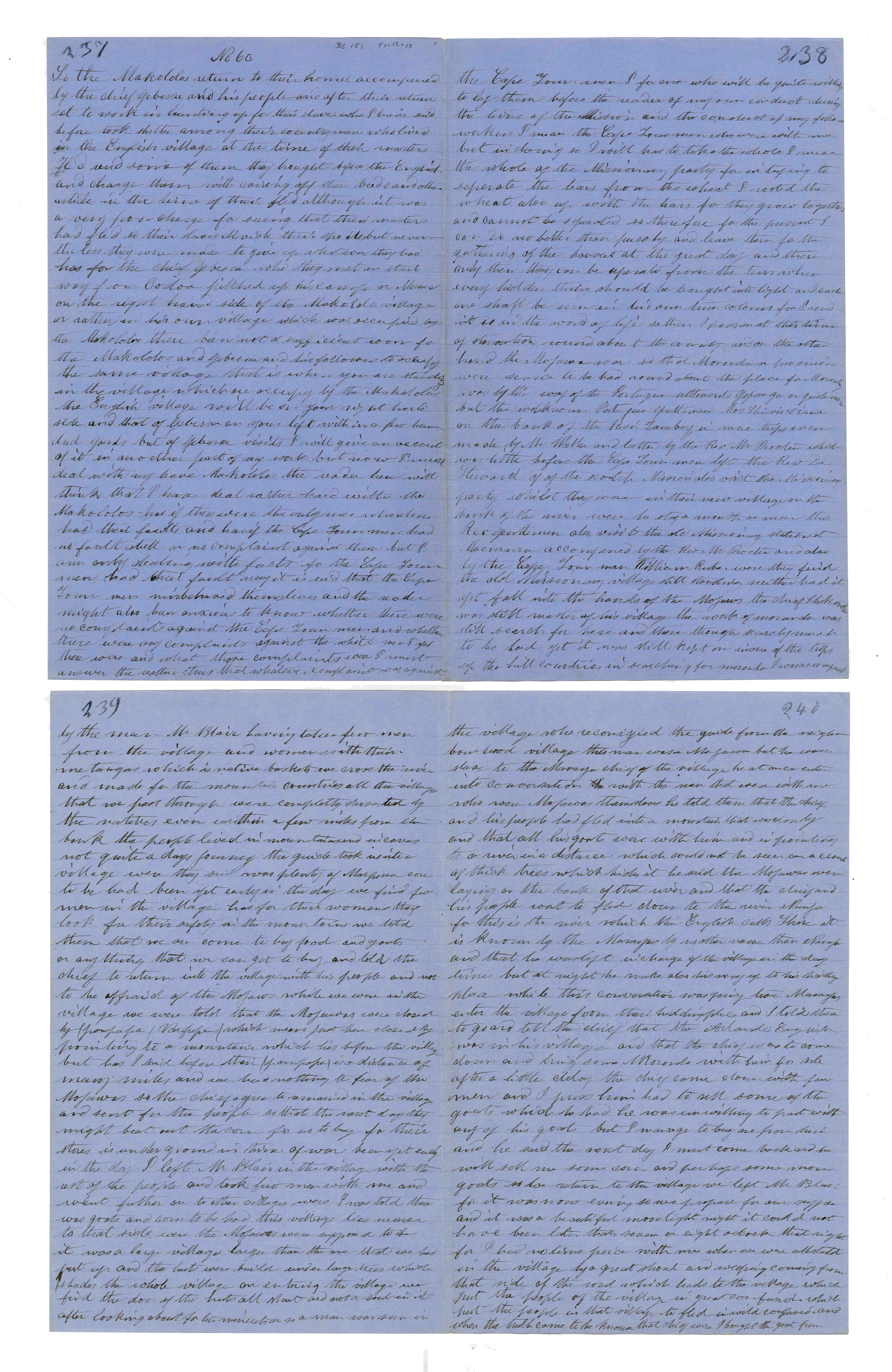 Sheet No. 60 of 'A Negro's History of Bishop Mackenzie's Mission to Central Africa' (MS), partly corrected by WHI Bleek. The Universities' Mission to Central Africa (UMCA), led by Bishop Charles Mackenzie, operated in a region that crossed what are now the borders of Mozambique and Malawi (formerly Nyasaland). After Mackenzie's death (in 1862) and the failure of the Magomero mission, the UMCA relocated to other areas, including Zanzibar, where it became very successful.