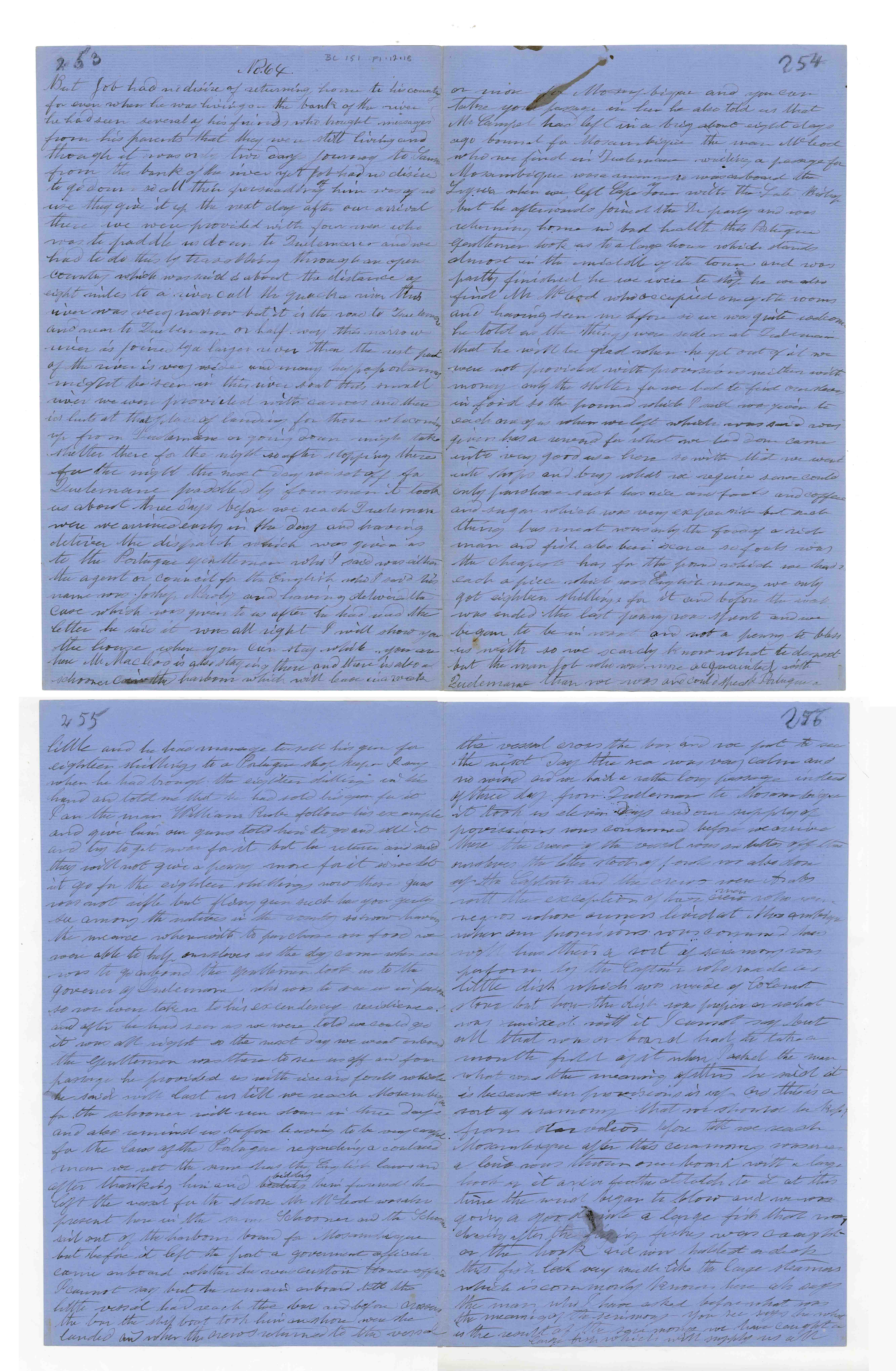 Sheet No. 64 of 'A Negro's History of Bishop Mackenzie's Mission to Central Africa' (MS), partly corrected by WHI Bleek. The Universities' Mission to Central Africa (UMCA), led by Bishop Charles Mackenzie, operated in a region that crossed what are now the borders of Mozambique and Malawi (formerly Nyasaland). After Mackenzie's death (in 1862) and the failure of the Magomero mission, the UMCA relocated to other areas, including Zanzibar, where it became very successful.
