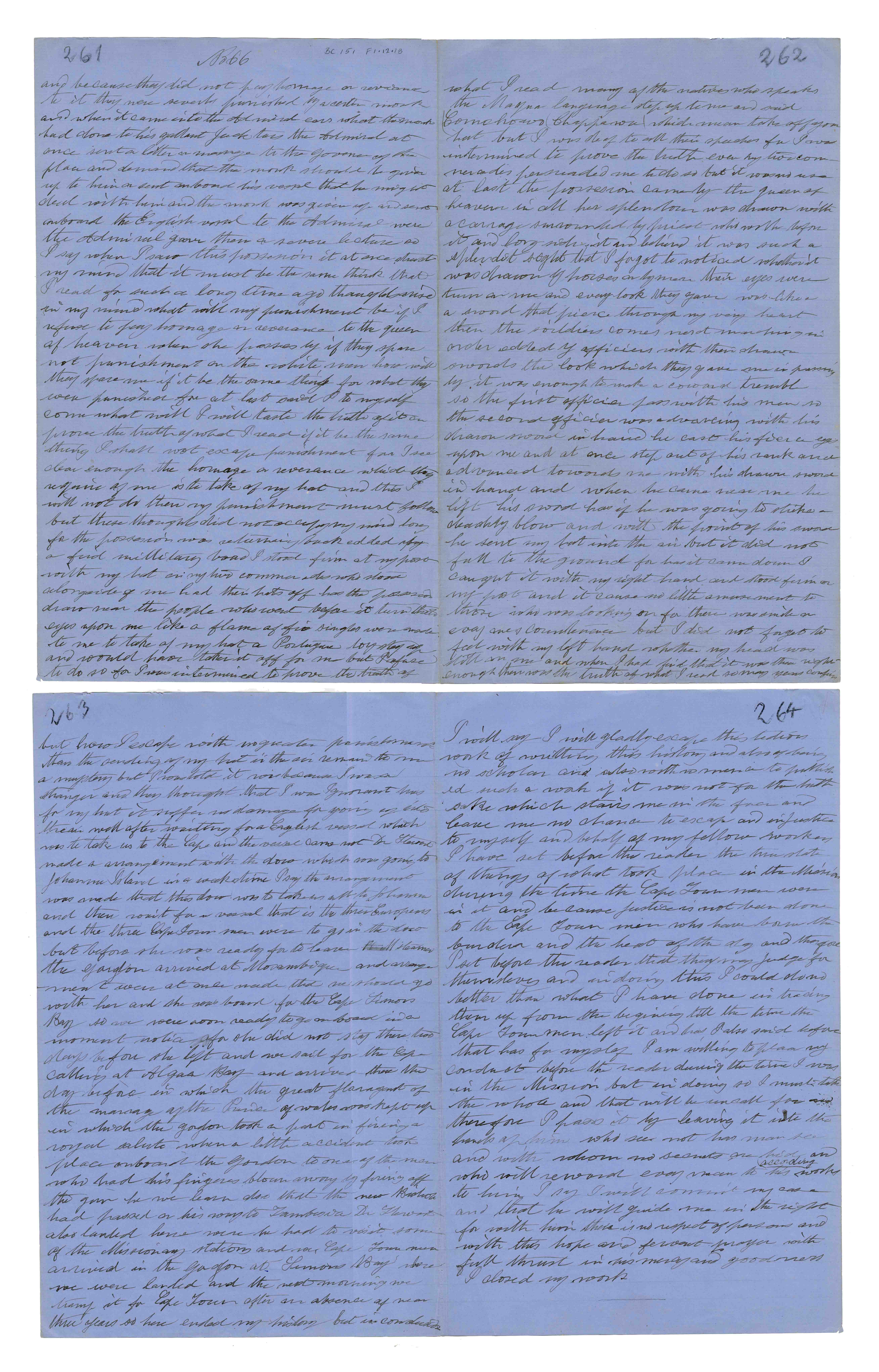 Sheet No. 66 of 'A Negro's History of Bishop Mackenzie's Mission to Central Africa' (MS), partly corrected by WHI Bleek. The Universities' Mission to Central Africa (UMCA), led by Bishop Charles Mackenzie, operated in a region that crossed what are now the borders of Mozambique and Malawi (formerly Nyasaland). After Mackenzie's death (in 1862) and the failure of the Magomero mission, the UMCA relocated to other areas, including Zanzibar, where it became very successful.