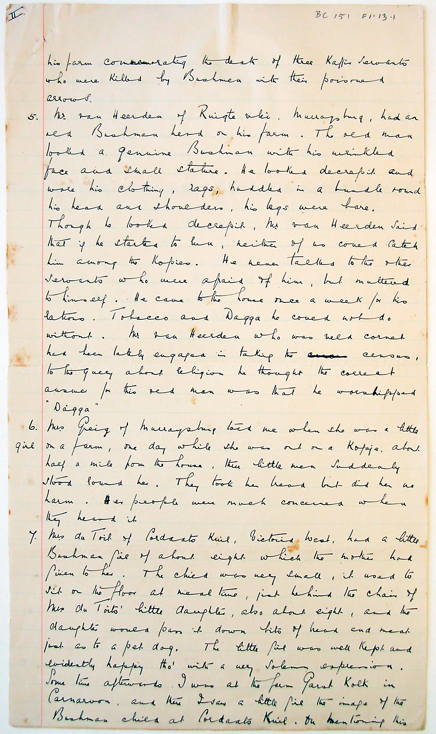 A series of anecdotes by white farmers from the Calvinia, Murraysburg, Victoria West, and Vosburg districts entitled '[']Bushman' Notes' (MS). These are copies.