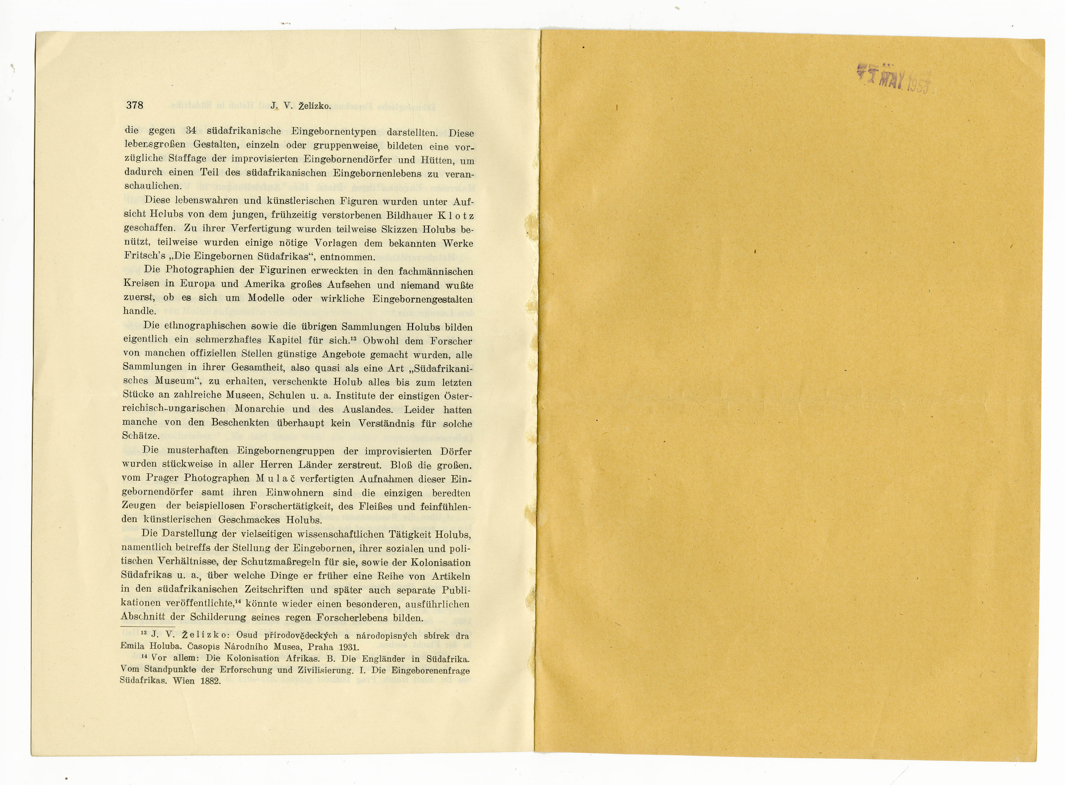 Reprint of 'Ethnologische Forschungen des Emil Holub in Südafrika in den Jahren 1872-1879 und 1883-1887' from Viennese periodical, Mitteilungen der Geographischen Gesellschaft (pp. 372-378).