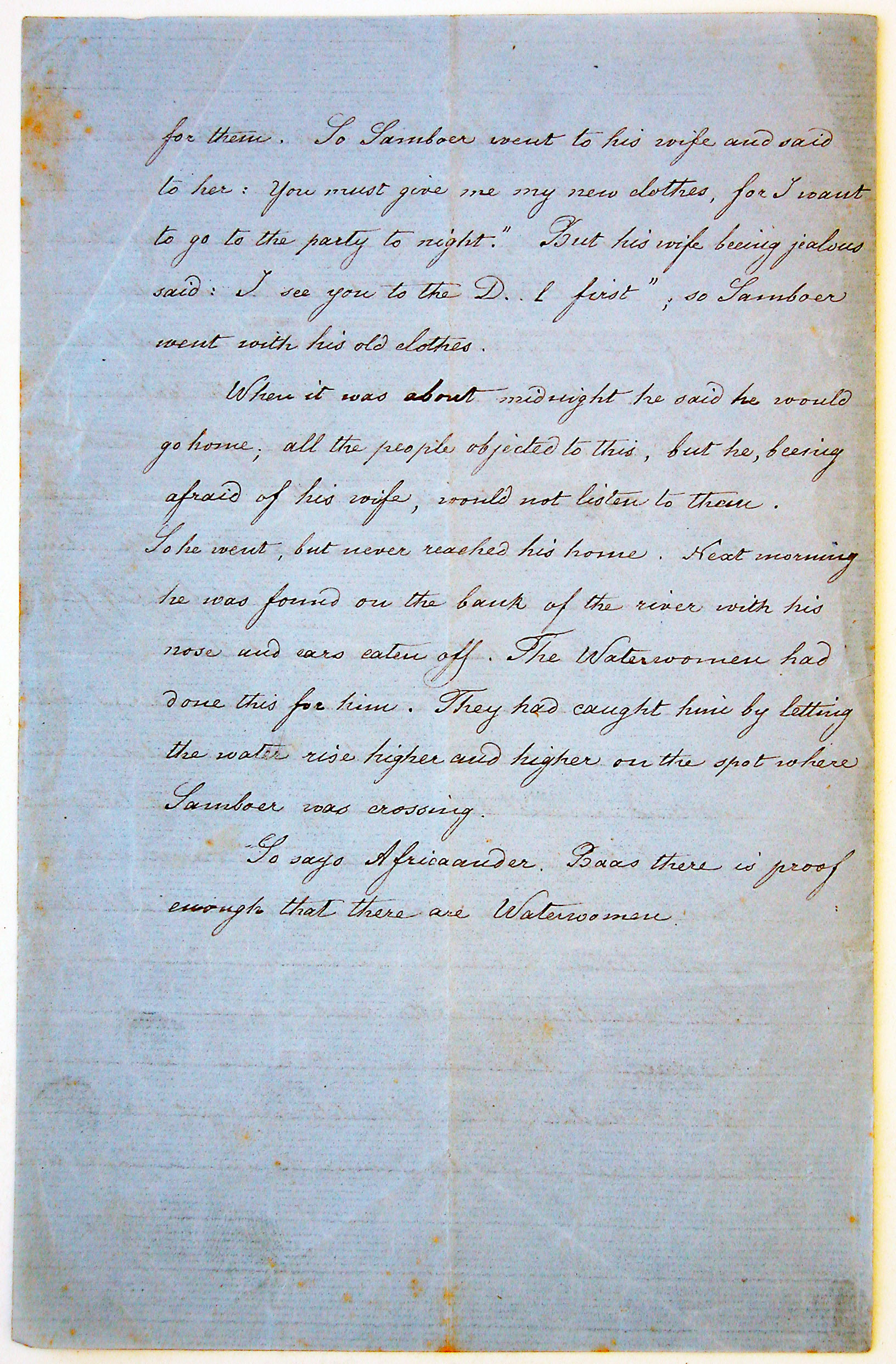 A story told by an old Bushman of around 70 or 80 years (unnamed). No locality or date (c. 1930s) recorded. The Waterwomen or Watermaidens described by the old Africaander sound like the New Maidens who became the Water's wives in WHI Bleek and LC Lloyd's |xam texts. Historically, 'Africaander' also referred to the multi-ethnic, often 'Afrikaans'/Dutch-speaking, semi-nomadic groups of southern Africa's hinterland, like the Oorlam (Dedering, 1997: 58-59). UCT's BC 151 library fonds speculatively dates this material 'c. 1930', however, 'Africaander' (one of several variant forms) had come to mean something different by the late early twentieth century, and would have been conspicuously archaic.