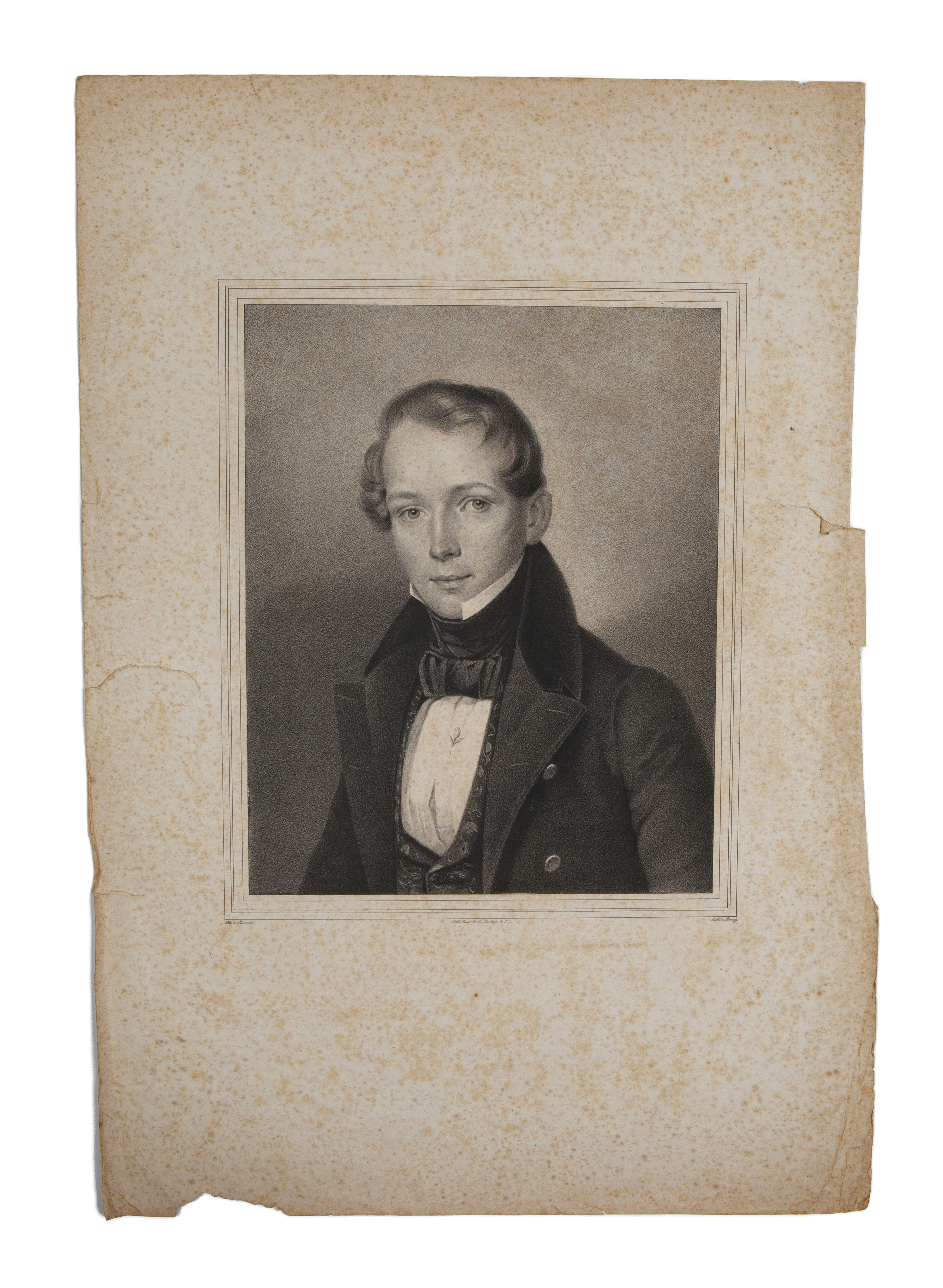 Portrait of "Onkel Ernst" as a young man, with a dueling scar across his left cheek. Lithograph 10 x 8 inches on sheet 19¼ x 3½ inches.