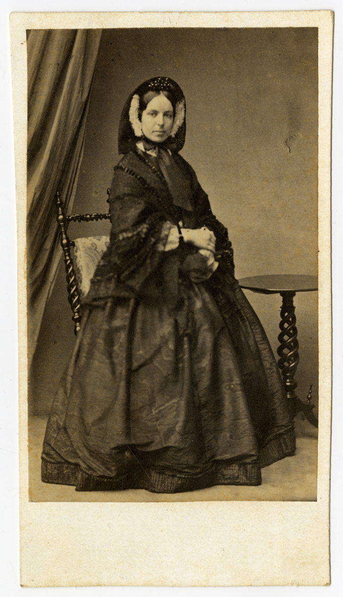 Carte de visite. Full-length portrait of Jemima Lloyd. The photograph has been pasted onto a 4¾ x 2½ inch card. Logo printed on back: an outline of camera mounted on a tripod. Printed within the camera outline is: "F. HAX BONN Sürst 71" A negative # 47957 is written at the top back. Oakleaf album