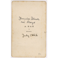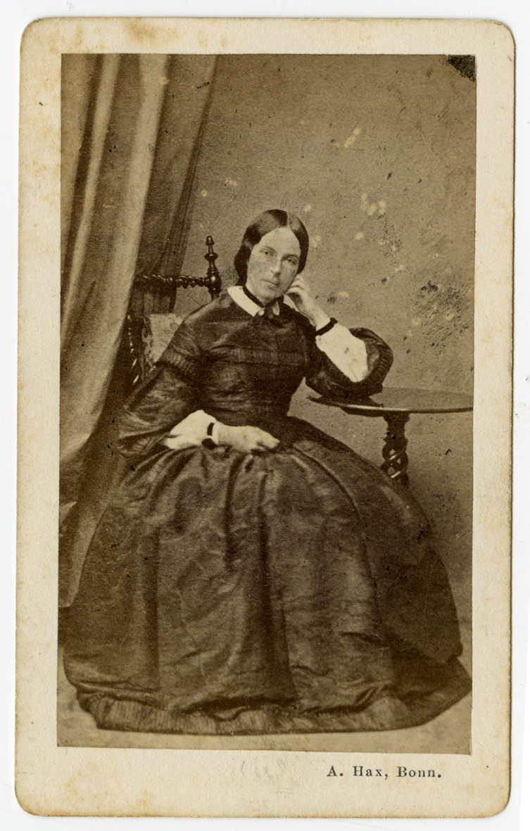 Carte de visite. Seated portrait. Shows Lloyd in indoor dress without bonnet and shawl. Photographer: "A. Hax, Bonn" printed on the mount below the photograph. Printed on back: A. Hax in Bonn. Oakleaf Album.