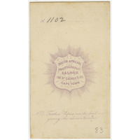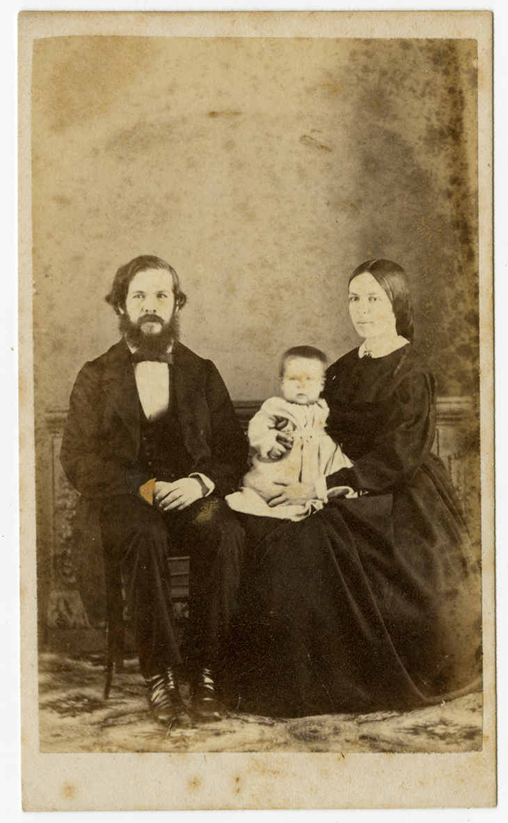 Carte de visite. Seated portrait of Wilhelm, Jemima and baby Edith Bleek. Printed on back in shield: South African Photographic Saloon, 50 St. George's Str., Cape Town. Neg. # 1102. Oakleaf Album.