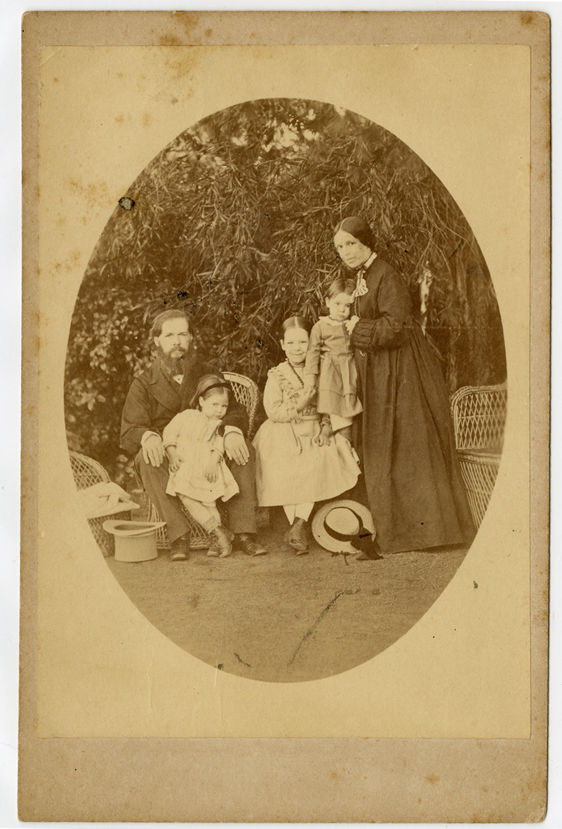 Cabinet print. Group portrait of Wilhelm and Jemima Bleek and three children taken in the garden of The Hill. Photographer: S.B. Barnard. The photograph, 5½ x 4 inches, is pasted onto a cabinet card 6¼ x 4¼ inches. Bleek 1872 Album. Copy in Light Brown Album