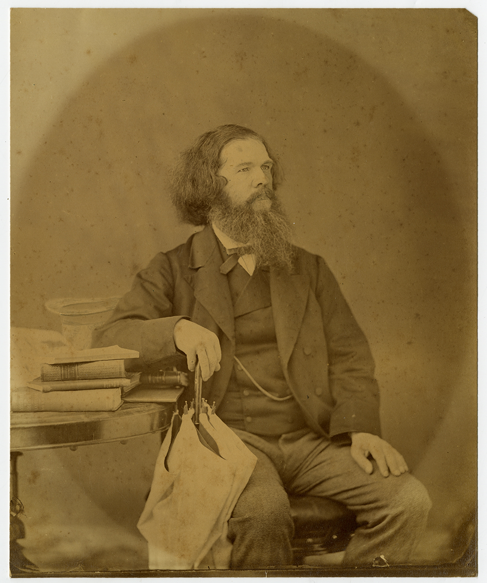 Bleek's arm rests on a table on and adjacent to some books, and he holds an umbrella in his right hand. "This photograph of Bleek was taken just a few months before he died." (Banks 2006, Caption to Fig.12.5, p. 310). Banks also comments on the selection of books displayed on the table. He gives the source of this reproduction as "Manuscripts and Archives, University of Cape Town Libraries," but does not reference the source of his date attribution. There is no date on the original in the Bleek-Lloyd Family Archive. As it is not clear whether the prints in the Bleek Collection or elsewhere in the public domain carry the photographer's imprint, this well-known portrait of Bleek is listed here.