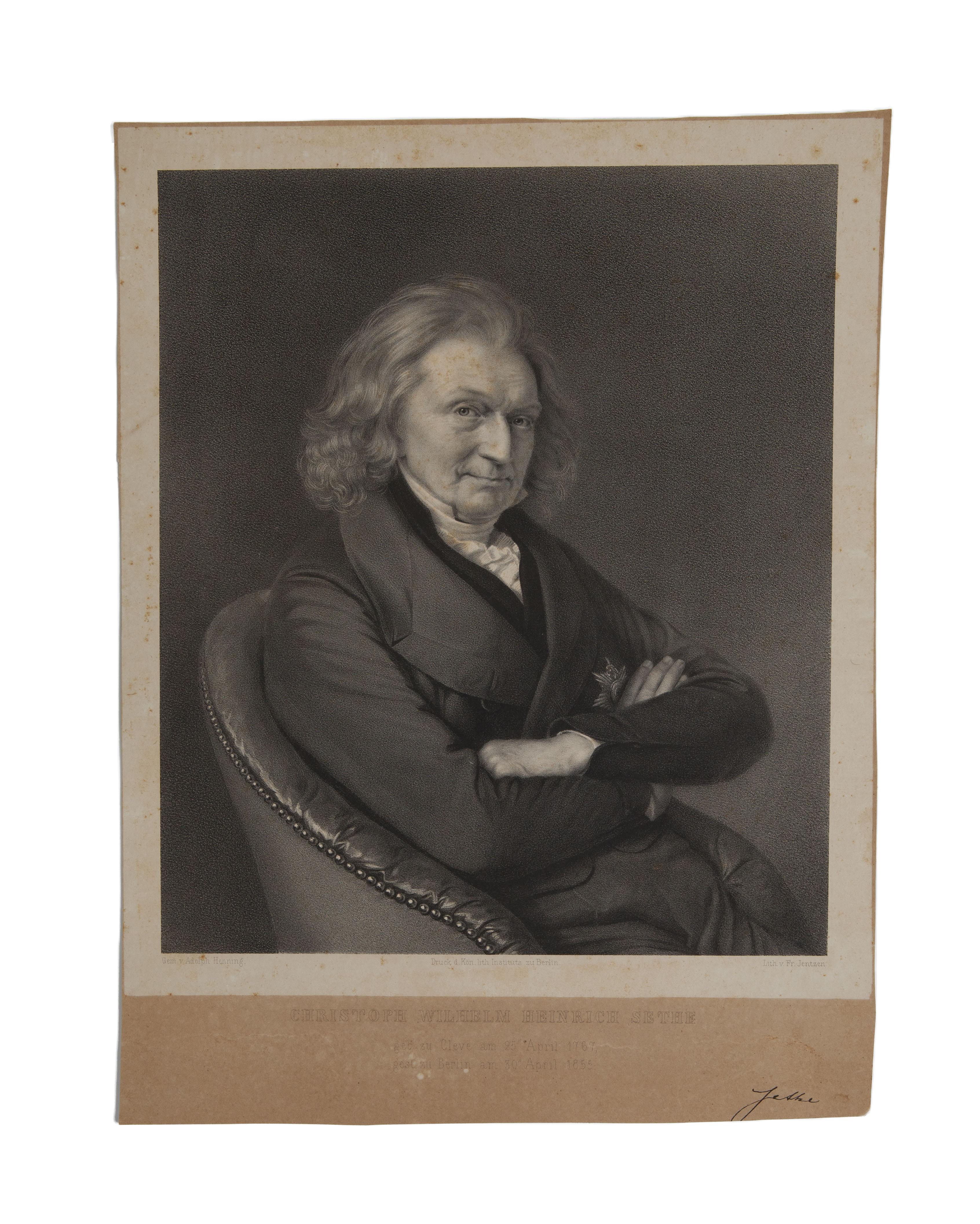 An older likeness of Christoph Sethe. Below the portrait is printed: geb. Zu Cleve am. 25 April 1767, gest zu Berlin am 30 April 1855. Lithographic credits: Gem v. Arnulph Henning Druk d. Kon. Lith Instituts zu Berlin Lith v Fr Jentzen. Lithograph 13 x 11 inches on sheet 19¼ x 16 inches.