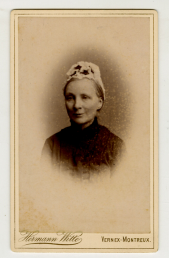 Carte de visite. Head and shoulders portrait. Photographer: Hermann Witte, Vernex-Montreux. 4 x 2½ inches.