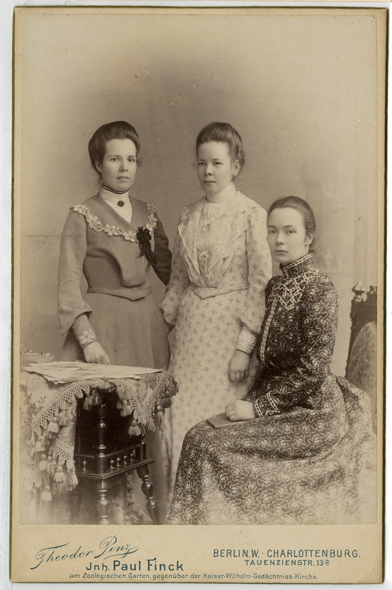 Cabinet print. Studio portrait. Left to right: Doris, Helma and Margie Bleek. Photographer: Theodor Penz. Berlin W. Charlottenburg, Tauenzienstr. 13a. Written in pencil on the back: Margie, Doris & Helma.