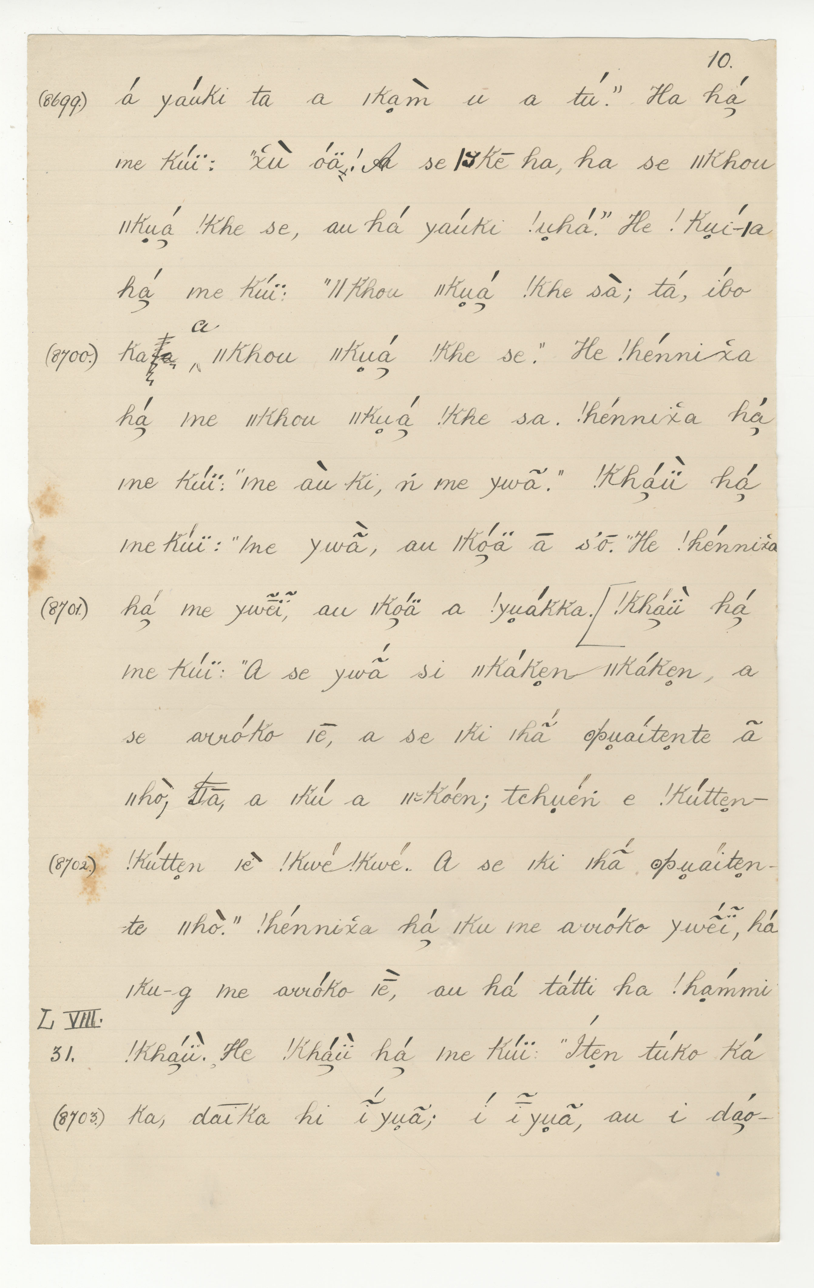 Manuscript page taken from |han≠kass'o's story, The Lizard, the Mice and the Mantis (includes the song of the Agama lizard) -- in Lloyd notebook 30 (dated 1879 [started]) and 31 (dated 1879 [started]), pages 8699 to 8703.