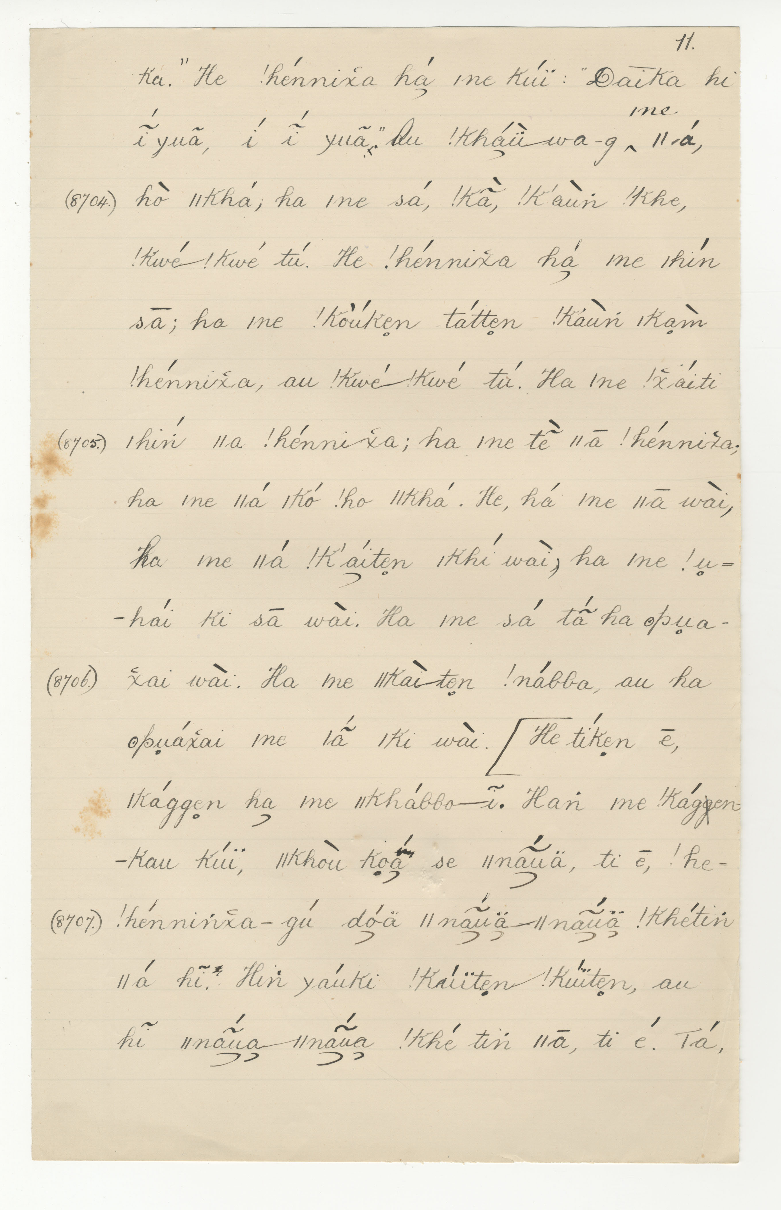Manuscript page taken from |han≠kass'o's story, The Lizard, the Mice and the Mantis (includes the song of the Agama lizard) -- in Lloyd notebook 31 (dated 1879 [started]), pages (continuing from) 8703 to 8707.