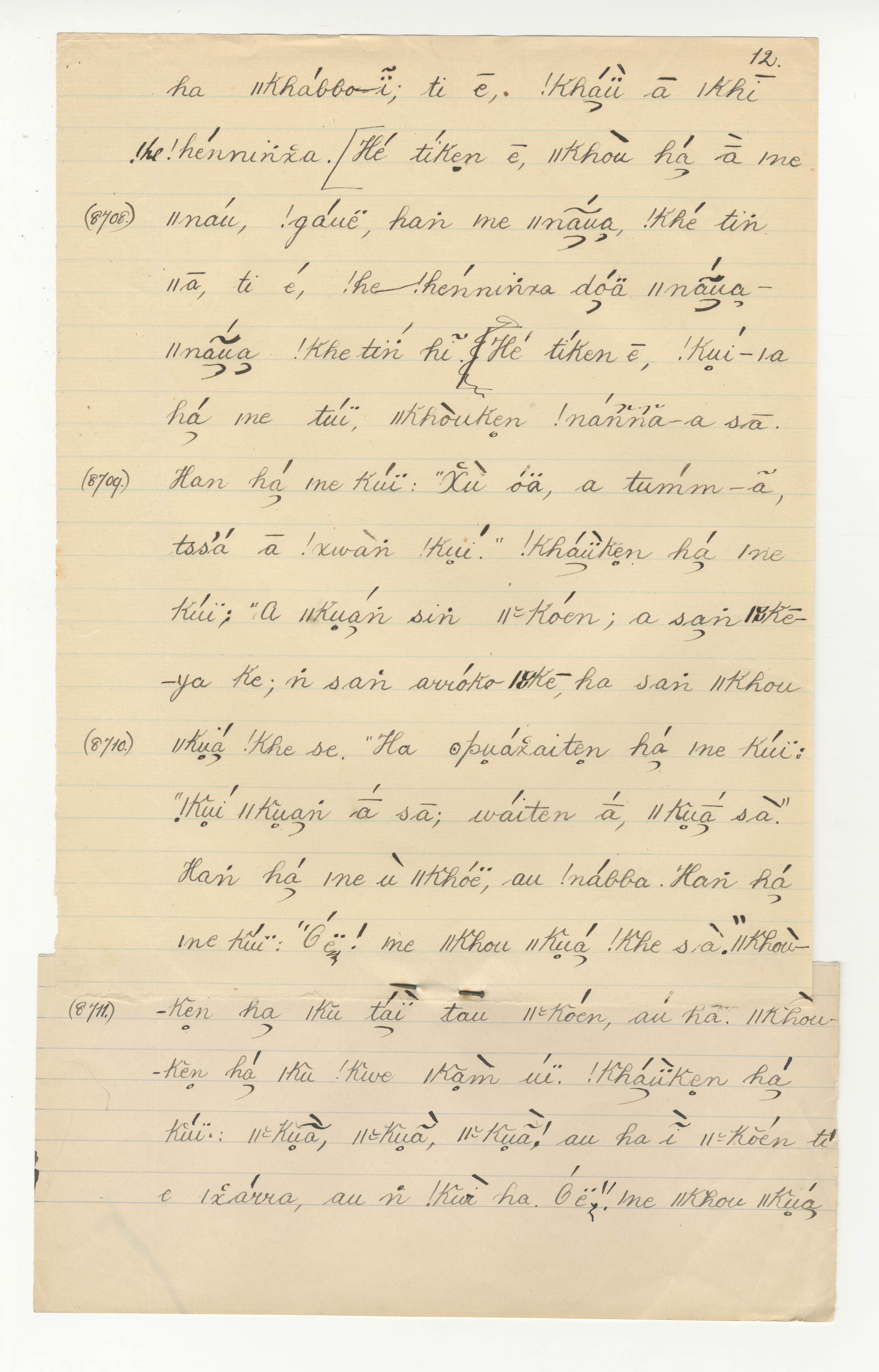 Manuscript page taken from |han≠kass'o's story, The Lizard, the Mice and the Mantis (includes the song of the Agama lizard) -- in Lloyd notebook 31 (dated 1879 [started]), pages (continuing from) 8707 to 8711.