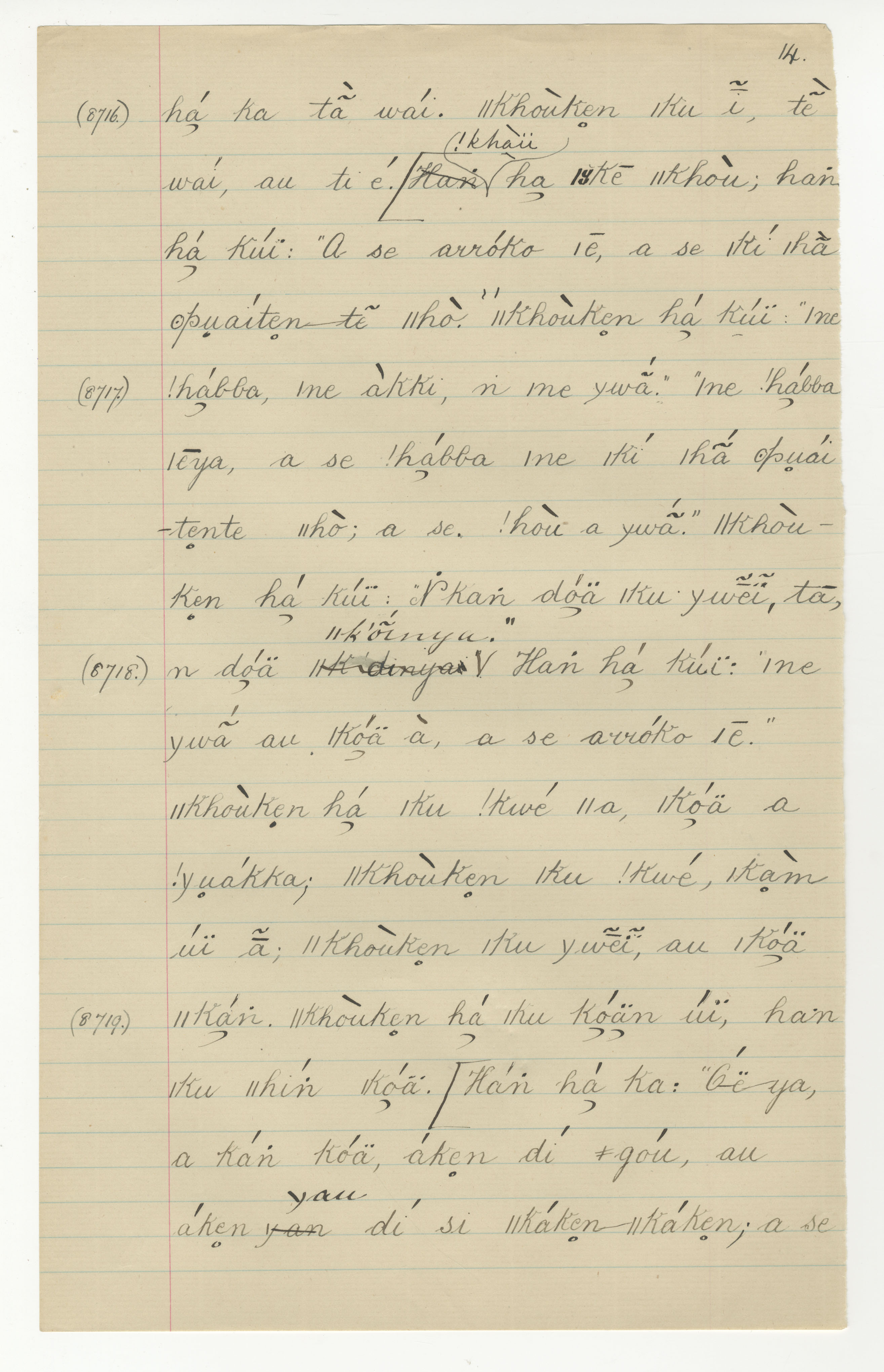 Manuscript page taken from |han≠kass'o's story, The Lizard, the Mice and the Mantis (includes the song of the Agama lizard) -- in Lloyd notebook 31 (dated 1879 [started]), pages 8716 to 8719.