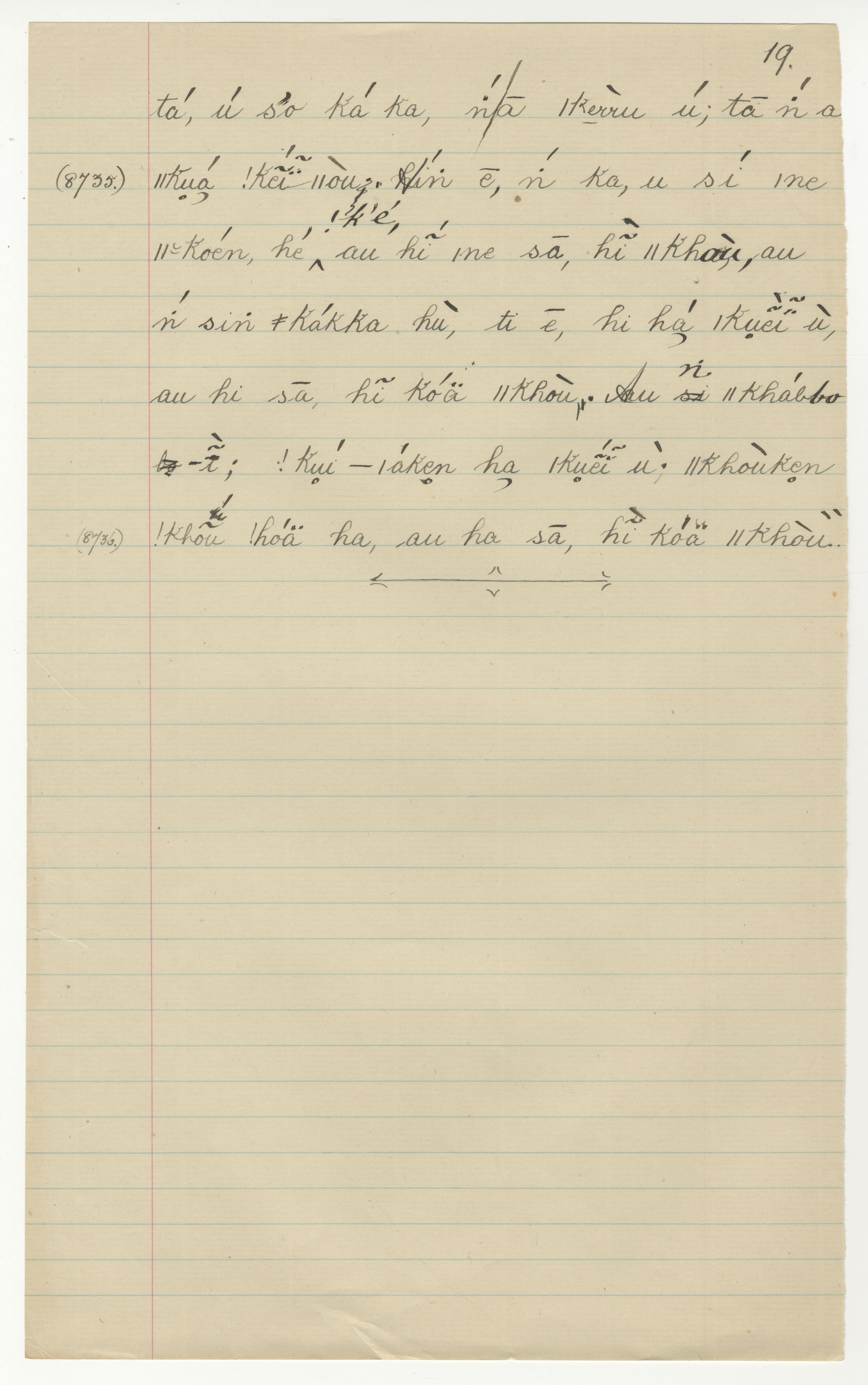Manuscript page taken from |han≠kass'o's story, The Lizard, the Mice and the Mantis (includes the song of the Agama lizard) -- in Lloyd notebook 31 (dated 1879 [started]), pages (continuing from) 8734 to 8736.