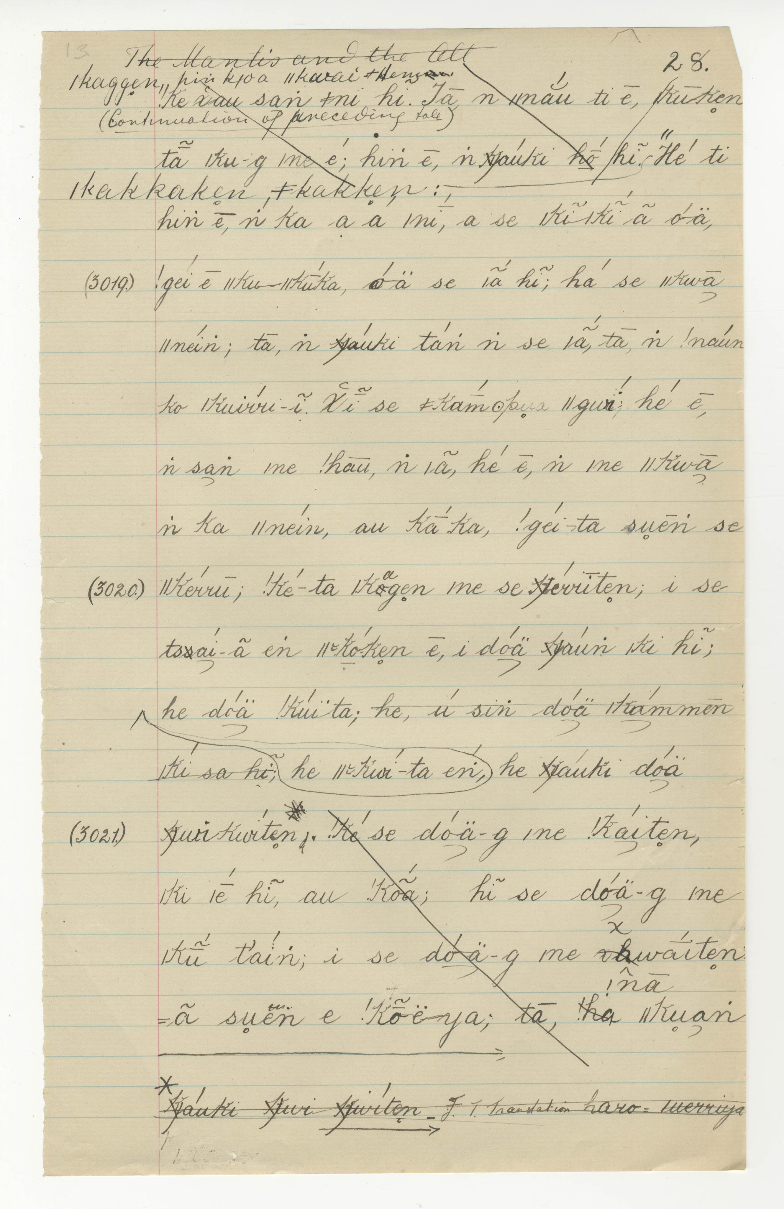 Manuscript page taken from ǁkabbo's story, The Mantis takes away the Tick's sheep (including Porcupine's speech concerning the coming of ǁkhwai-hemm) -- in Lloyd notebook 33 (dated 1873), pages (continuing from) 3019 to 3021.