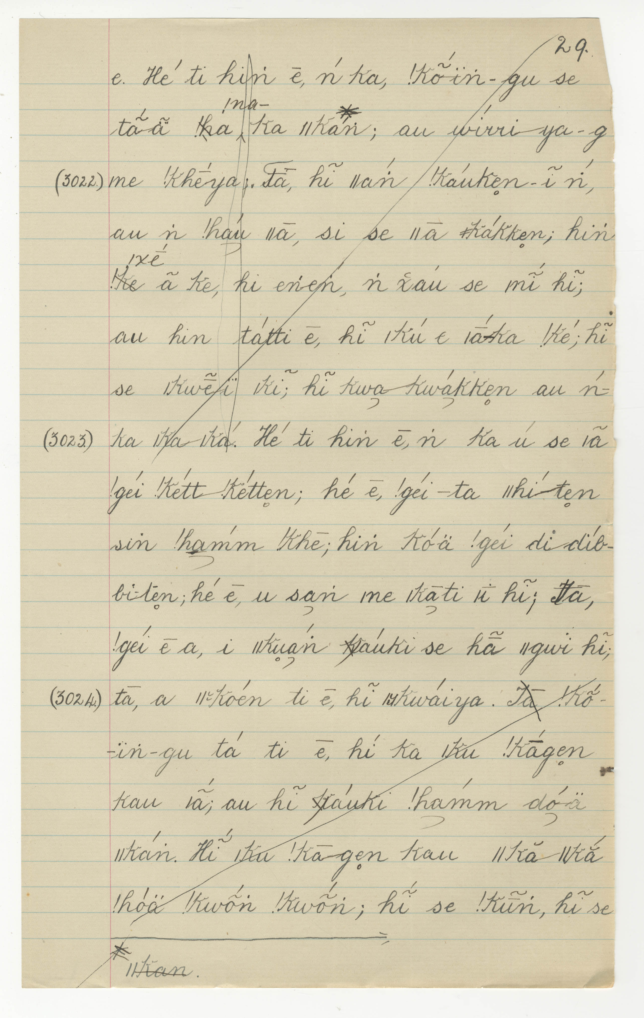 Manuscript page taken from ǁkabbo's story, The Mantis takes away the Tick's sheep (including Porcupine's speech concerning the coming of ǁkhwai-hemm) -- in Lloyd notebook 33 (dated 1873), pages (continuing from) 3021 to 3024.