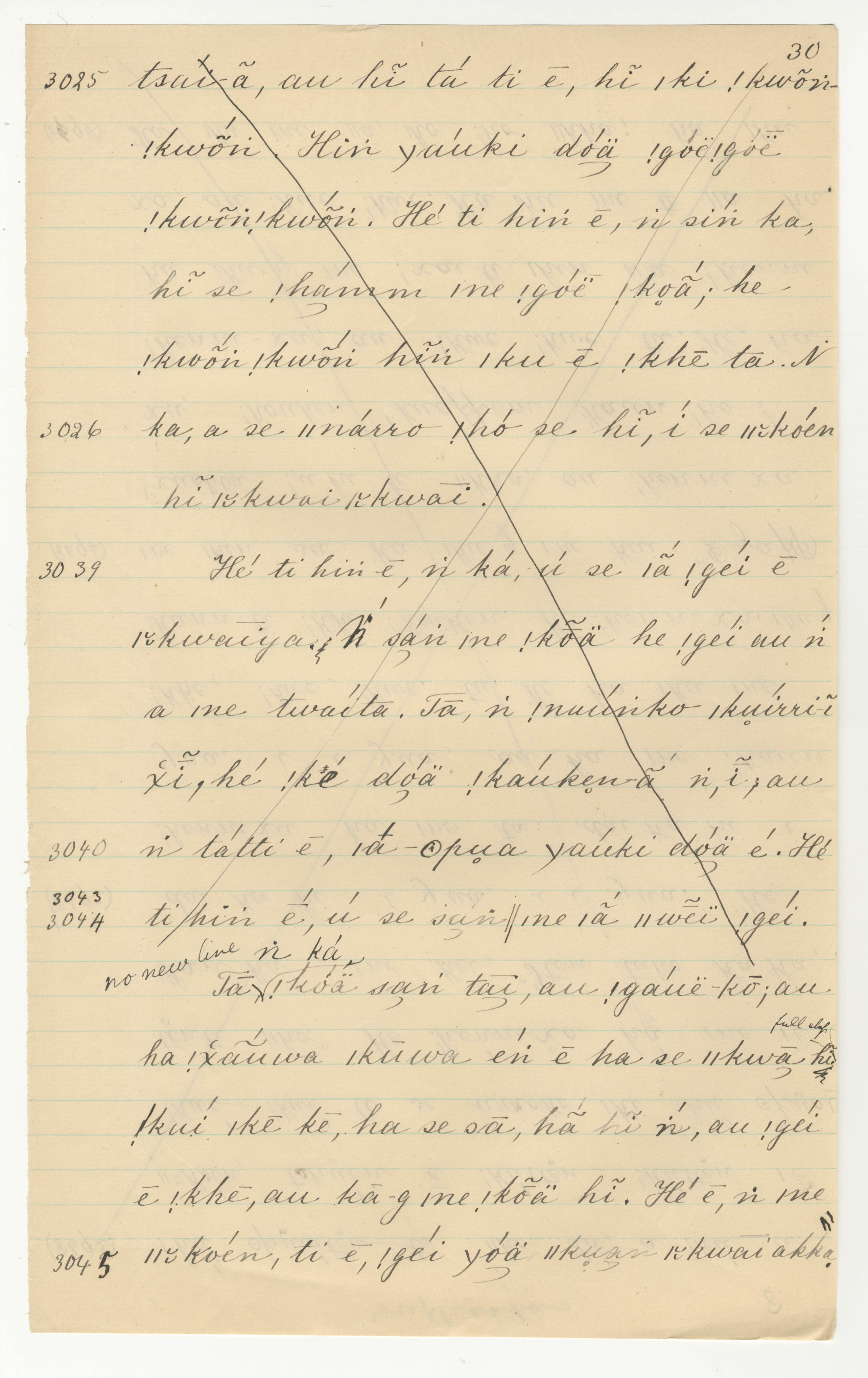 Manuscript page taken from ǁkabbo's story, The Mantis takes away the Tick's sheep (including Porcupine's speech concerning the coming of ǁkhwai-hemm) -- in Lloyd notebook 33 (dated 1873), pages 3025 to 3026, 3039 to 3040, and 3043 to 3045.