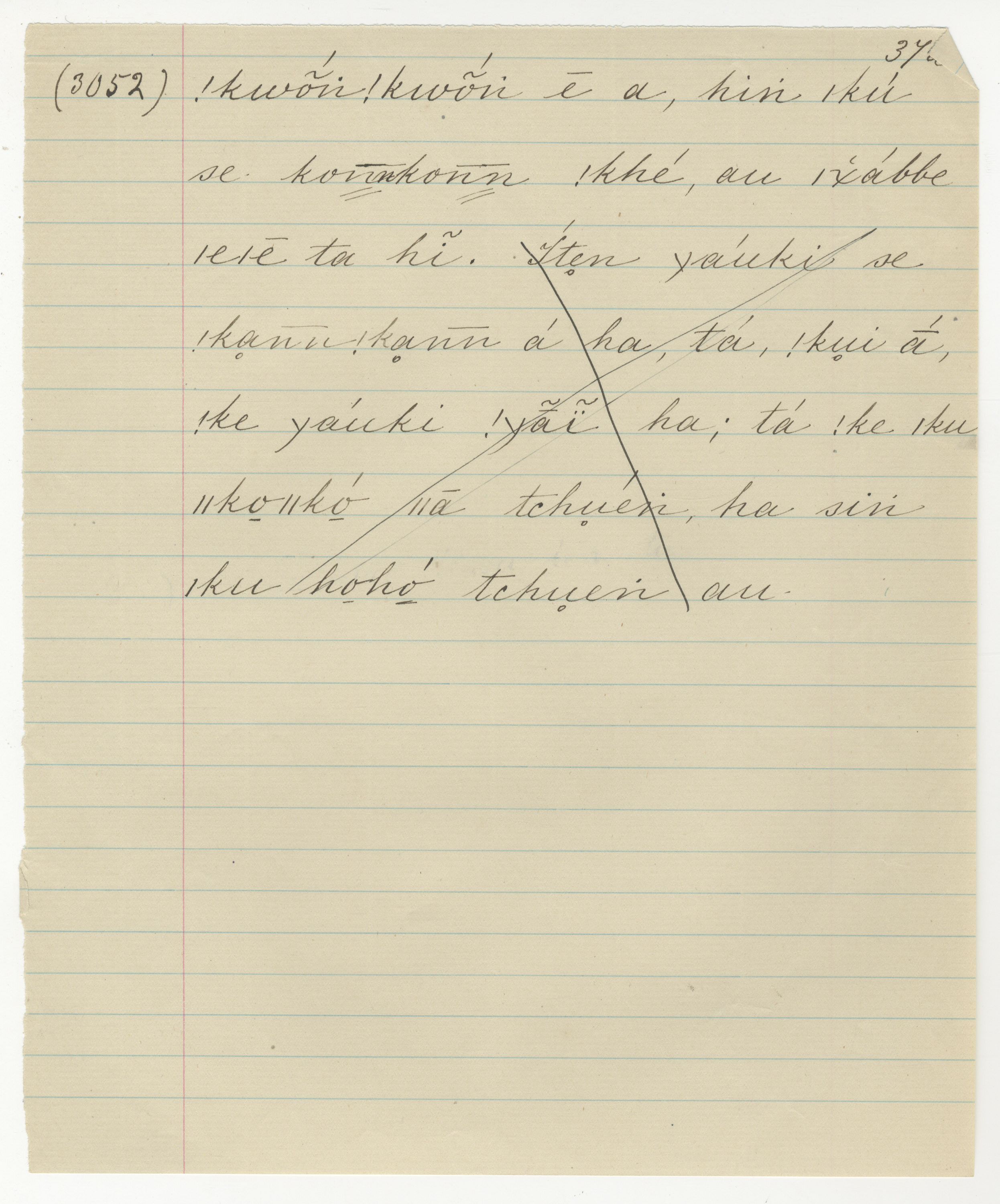 Manuscript page taken from ǁkabbo's story, The Mantis takes away the Tick's sheep (including Porcupine's speech concerning the coming of ǁkhwai-hemm) -- in Lloyd notebook 33 (dated 1873), page 3052.