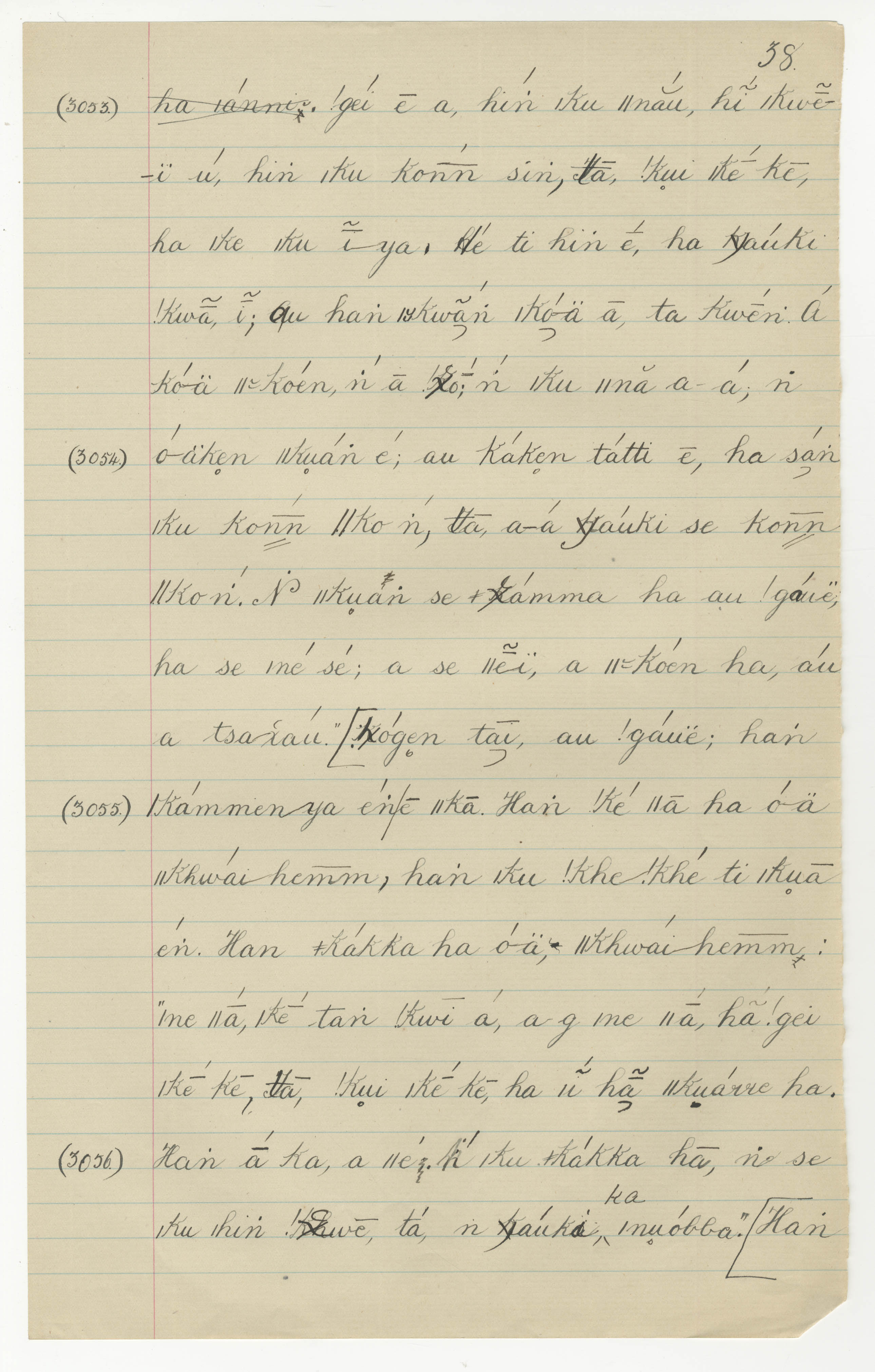 Manuscript page taken from ǁkabbo's story, The Mantis takes away the Tick's sheep (including Porcupine's speech concerning the coming of ǁkhwai-hemm) -- in Lloyd notebook 33 (dated 1873), pages 3053 to 3056.
