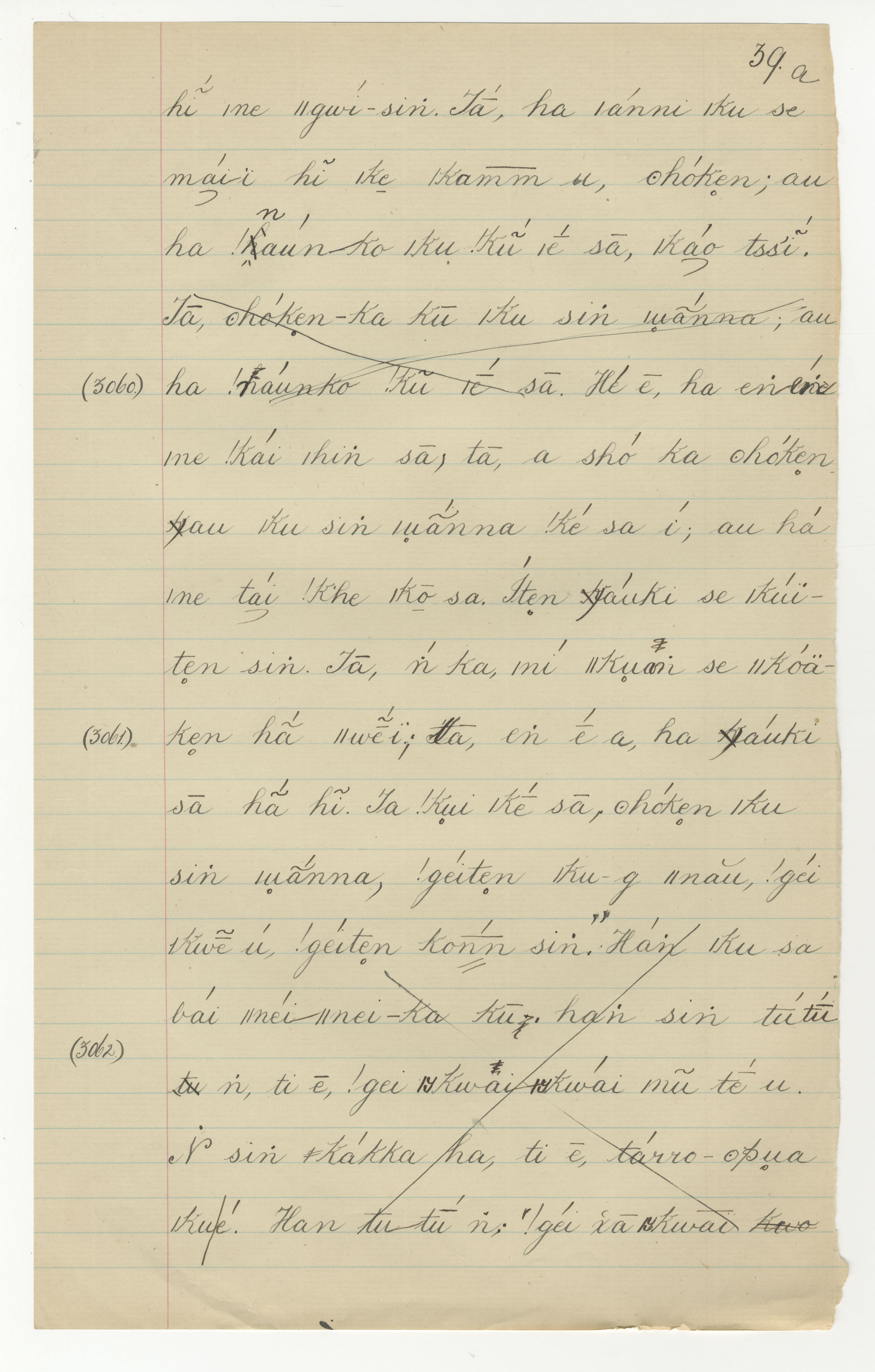 Manuscript page taken from ǁkabbo's story, The Mantis takes away the Tick's sheep (including Porcupine's speech concerning the coming of ǁkhwai-hemm) -- in Lloyd notebook 33 (dated 1873), pages (continuing from) 3059 to 3062.