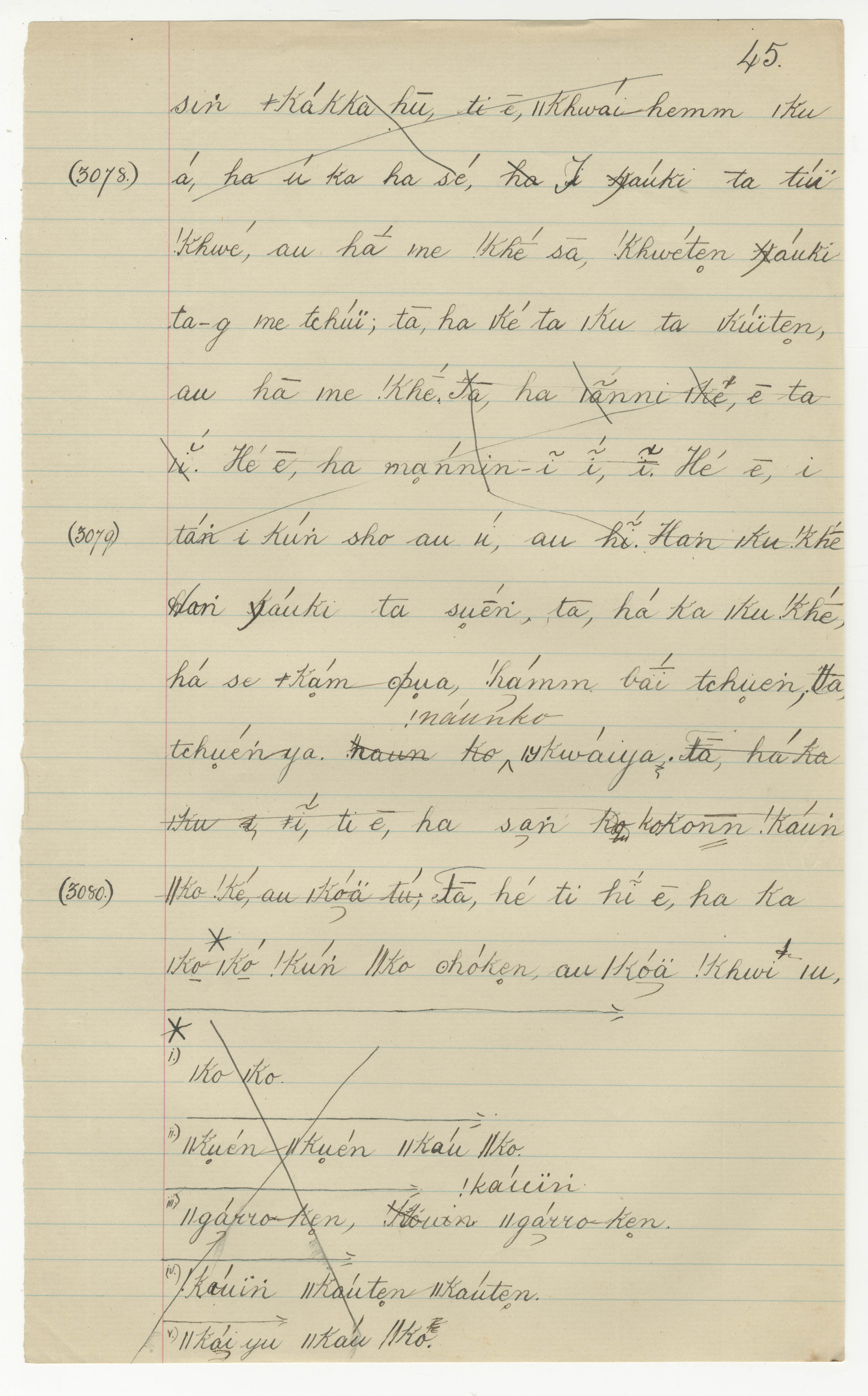 Manuscript page taken from ǁkabbo's story, The Mantis takes away the Tick's sheep (including Porcupine's speech concerning the coming of ǁkhwai-hemm) -- in Lloyd notebook 33 (dated 1873), pages (continuing from) 3077 to 3080.