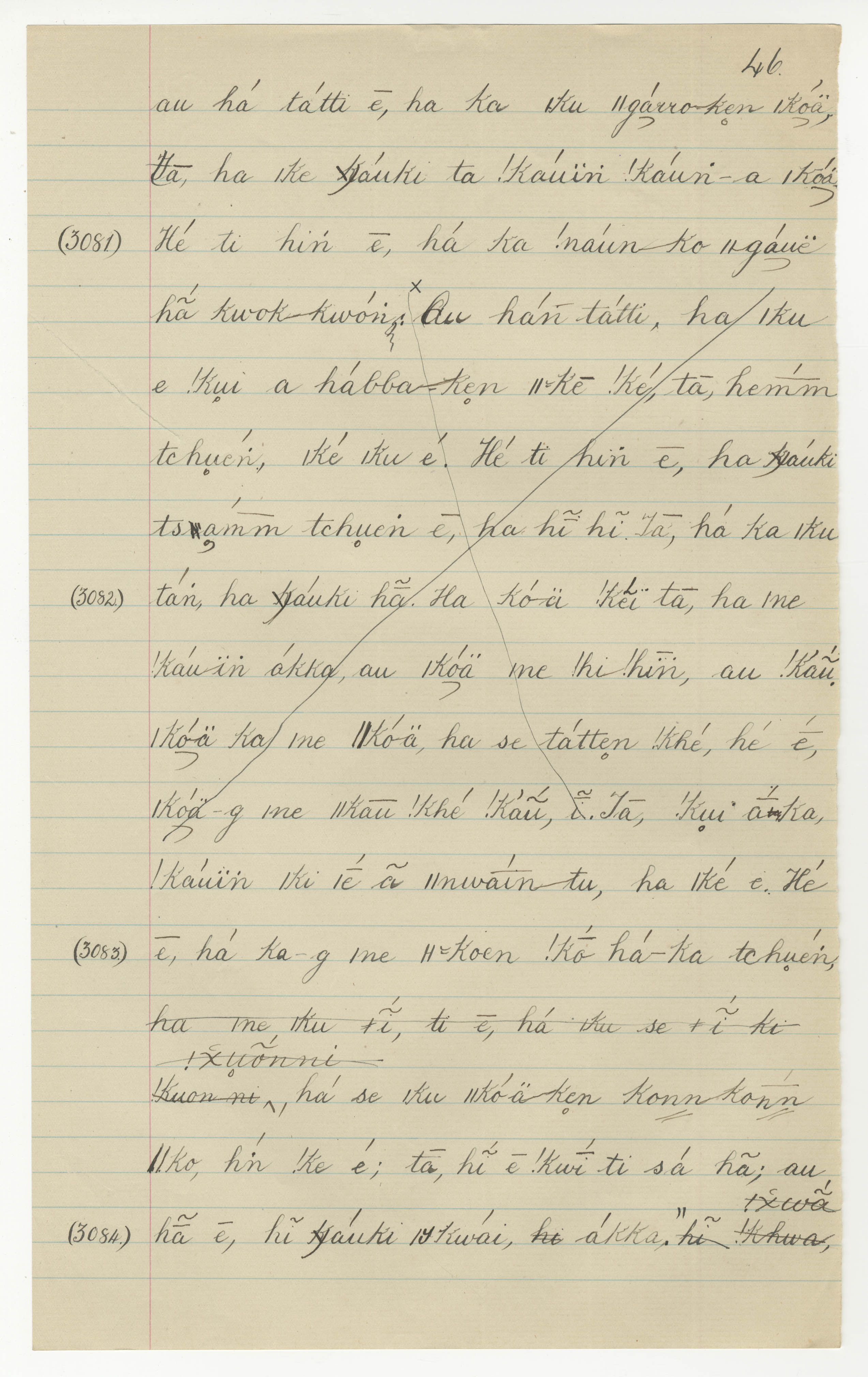 Manuscript page taken from ǁkabbo's story, The Mantis takes away the Tick's sheep (including Porcupine's speech concerning the coming of ǁkhwai-hemm) -- in Lloyd notebook 33 (dated 1873), pages (continuing from) 3080 to 3084.