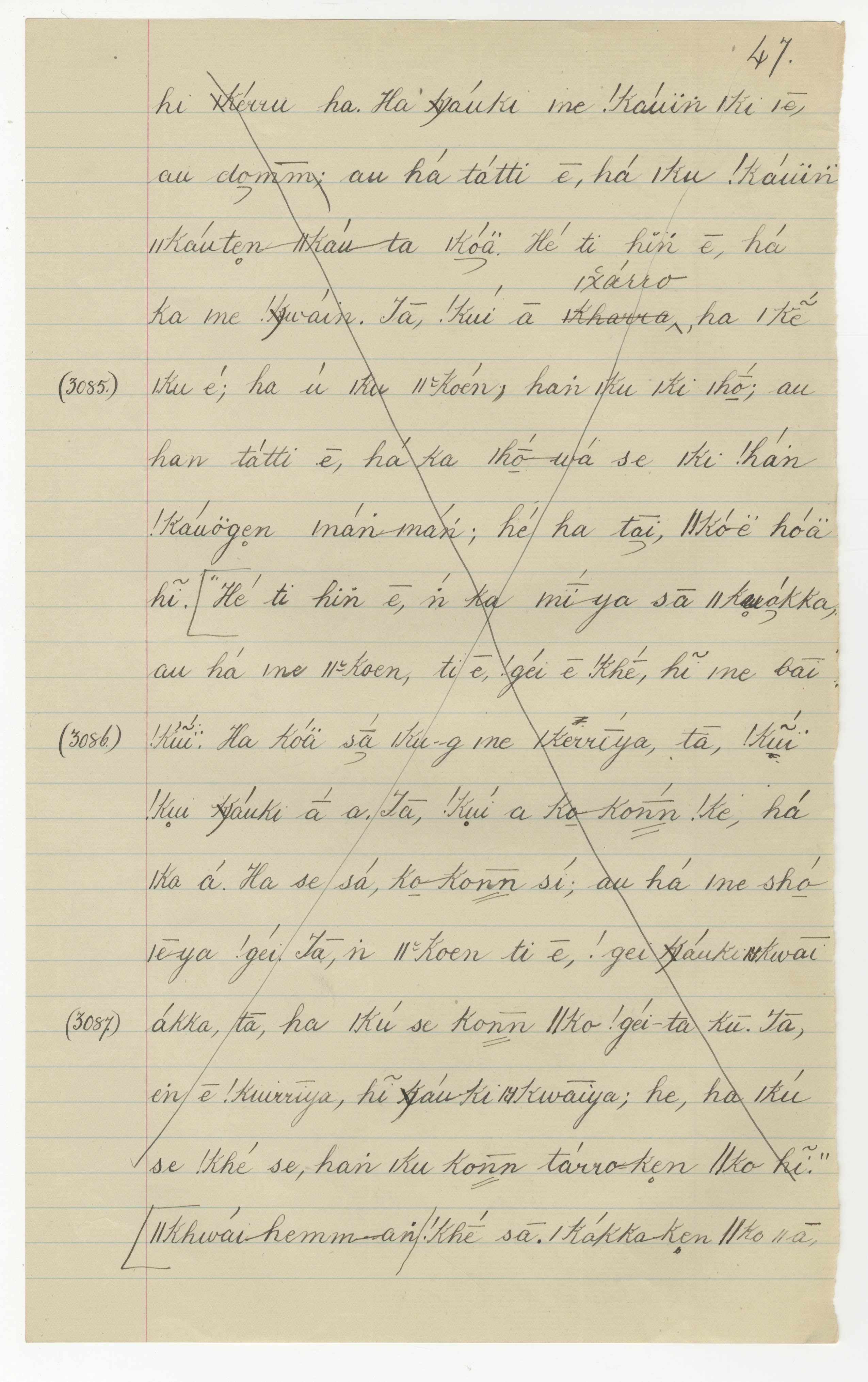 Manuscript page taken from ǁkabbo's story, The Mantis takes away the Tick's sheep (including Porcupine's speech concerning the coming of ǁkhwai-hemm) -- in Lloyd notebook 33 (dated 1873), pages (continuing from) 3084 to 3087.