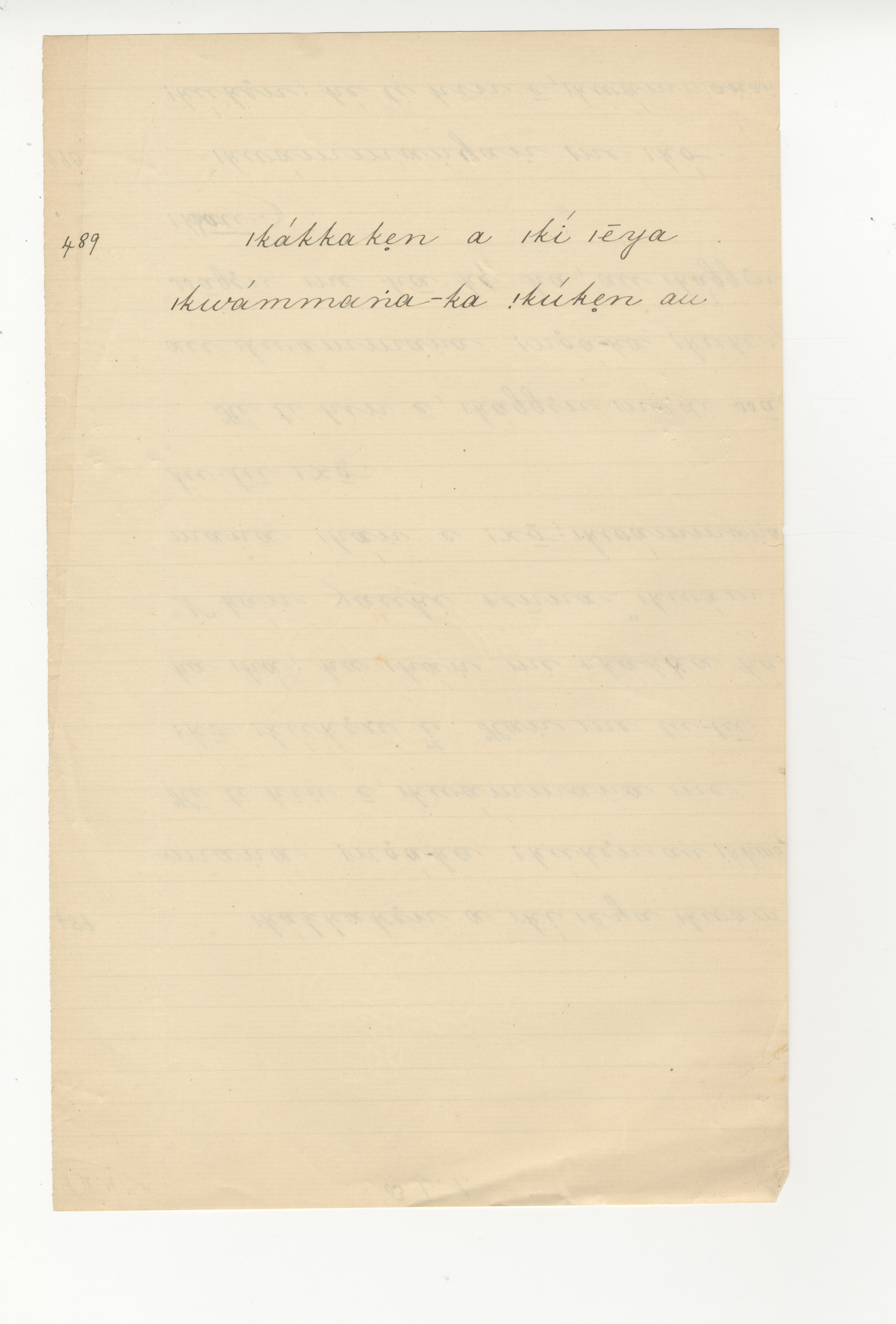 Manuscript (the reverse of the previous page), taken from ǁkabbo's story, The |kaggen who took |kammanga's shoe, and turned it into an eland -- in Lloyd notebook 4 (dated 1871), page 489.